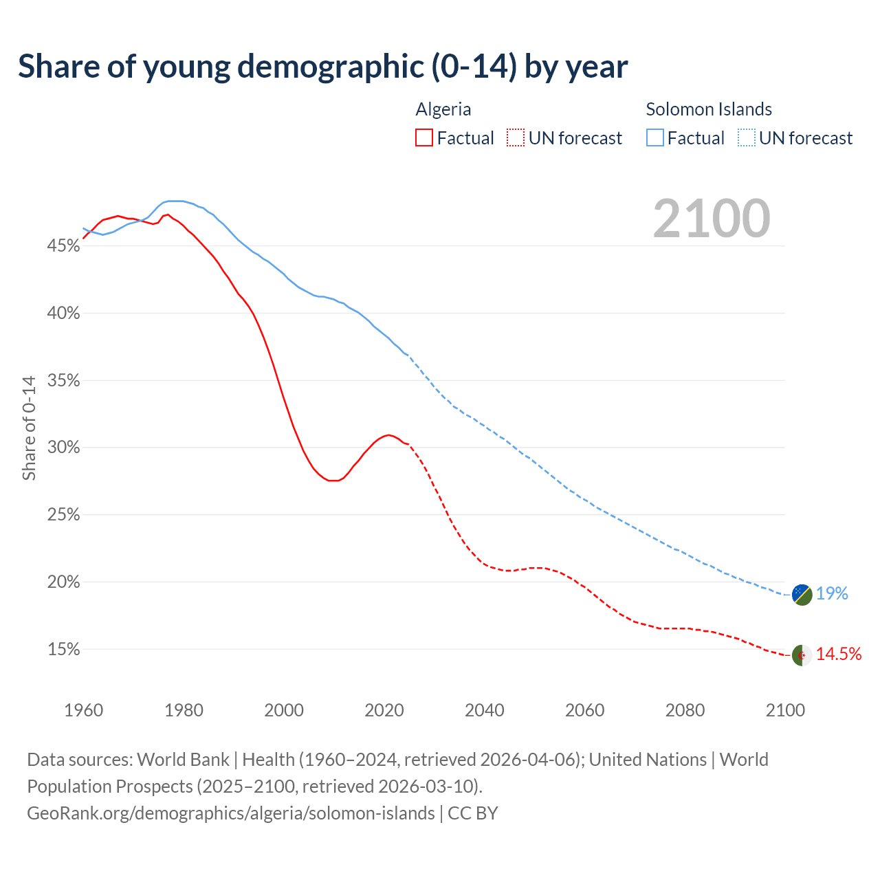 Median age Algeria vs Solomon Islands, 1960-2100