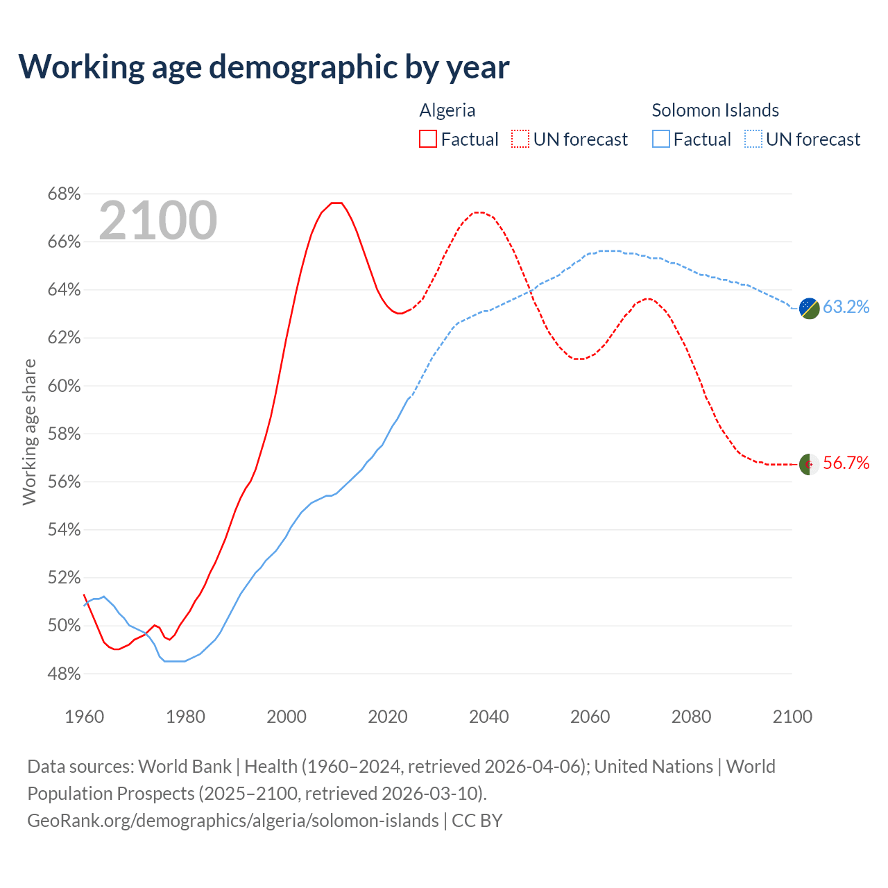- Algeria has 30.4M working age adults (aged 15-64) vs 513K in the Solomon Islands.