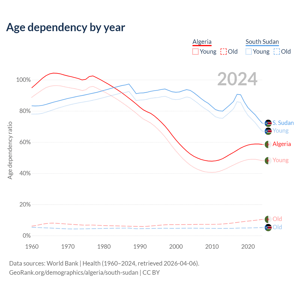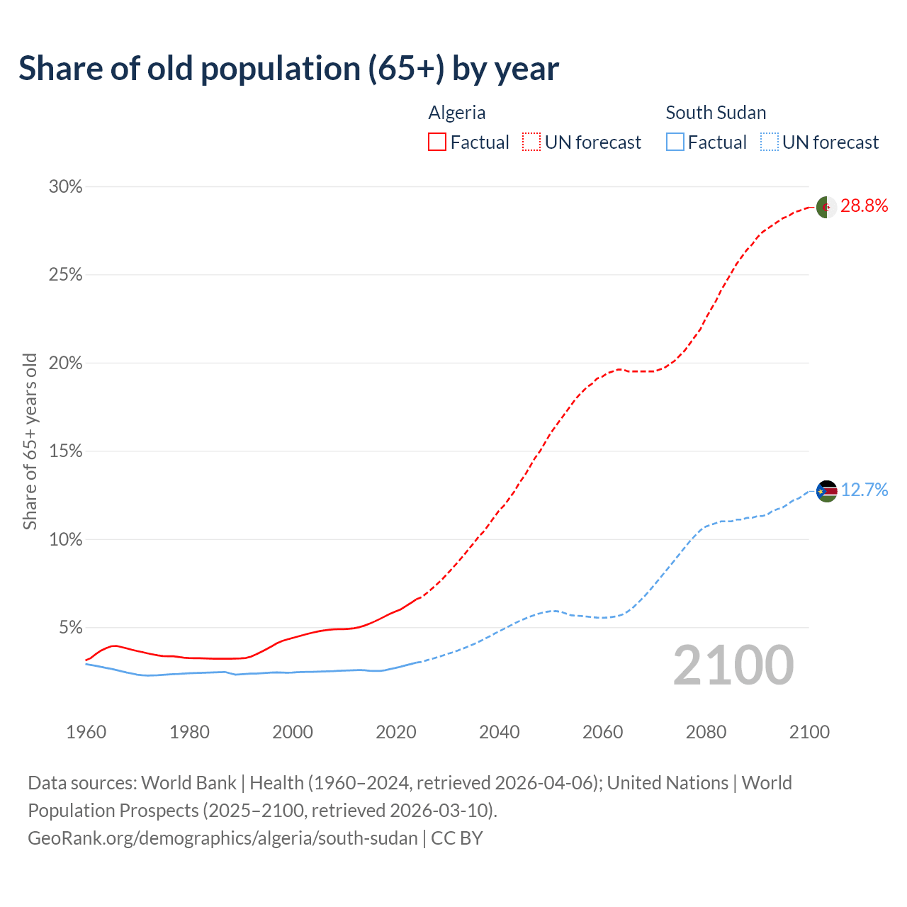 - The share of old-age demographic (65+) in Algeria is 6.58% vs 2.99% in South Sudan.