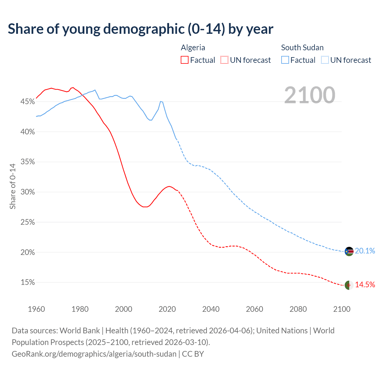 Median age Algeria vs South Sudan, 1960-2100