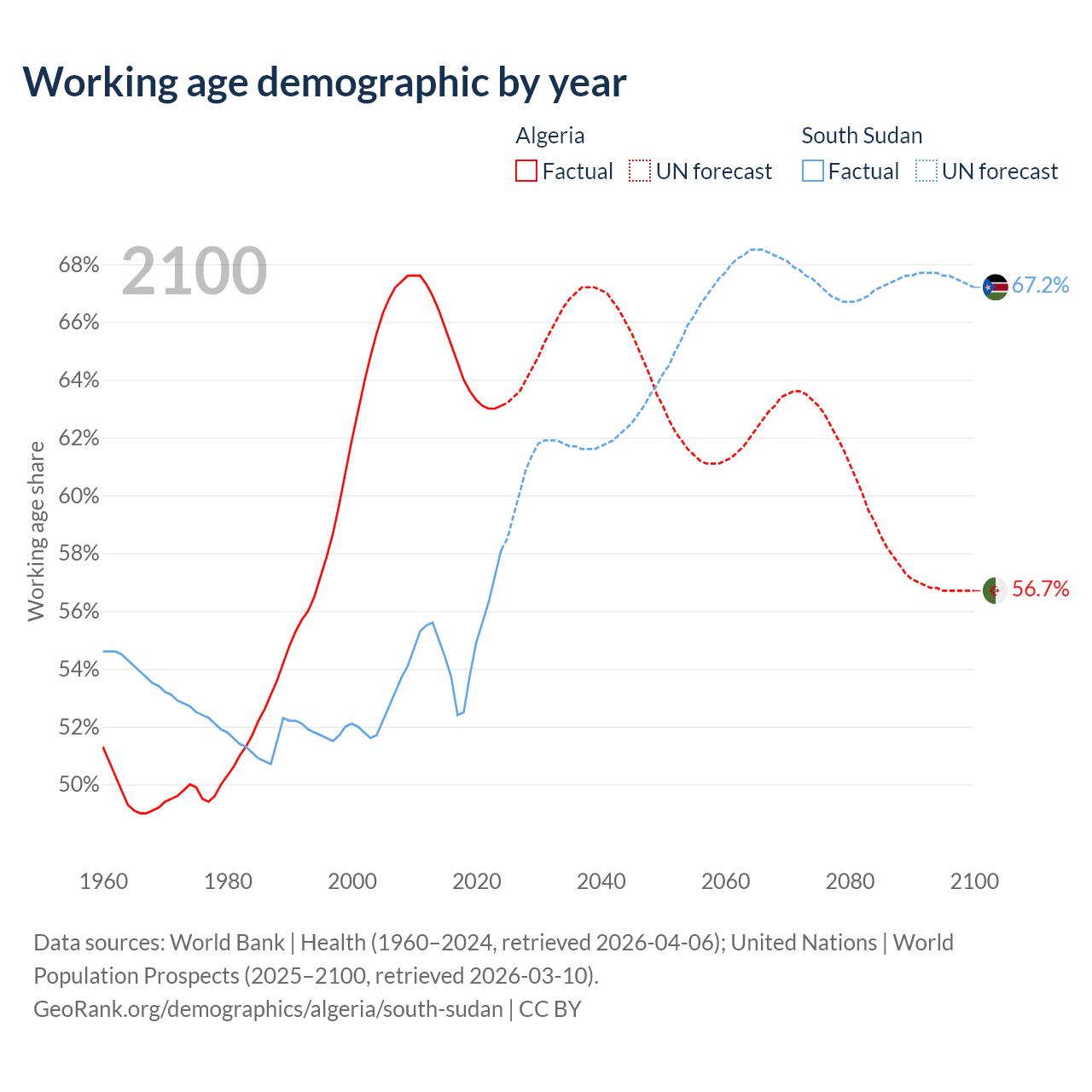 - Algeria has 30.4M working age adults (aged 15-64) vs 7.27M in South Sudan.