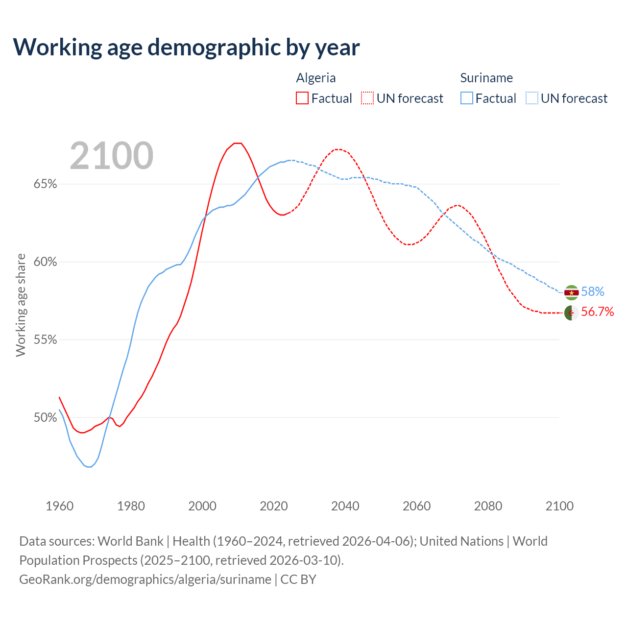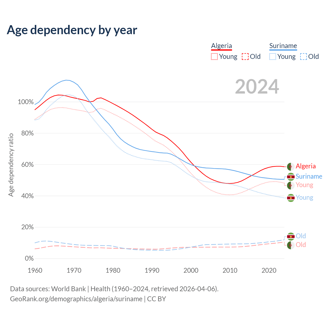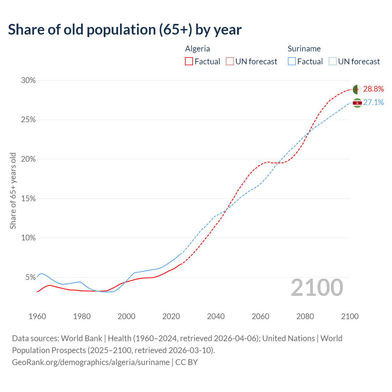 - The share of old-age demographic (65+) in Algeria is 6.58% vs 7.9% in Suriname.