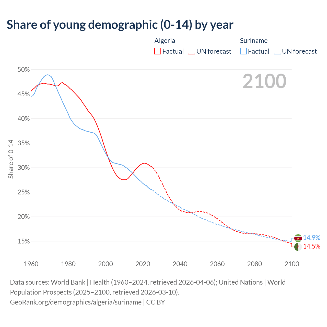 - The share of young demographic (0-15 years old) in Algeria is 30.3% vs 25.6% in Suriname.
