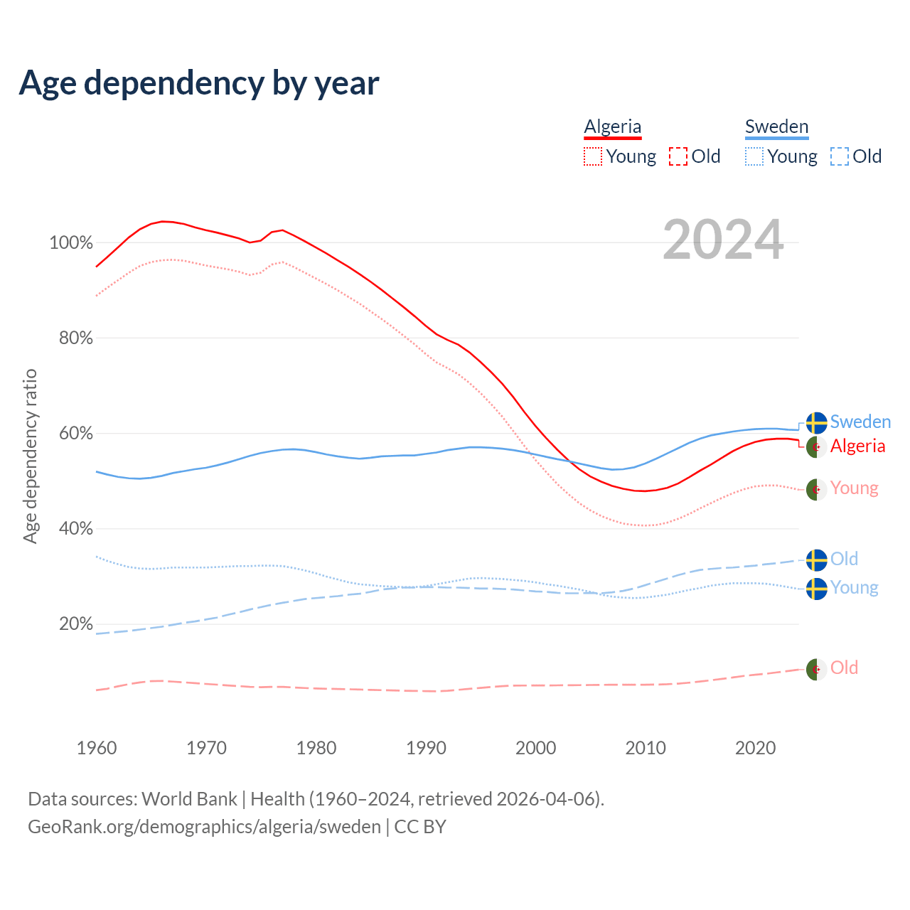 - Algeria is ranked 111/196 by median age (oldest to youngest) vs 39/196 for Sweden.