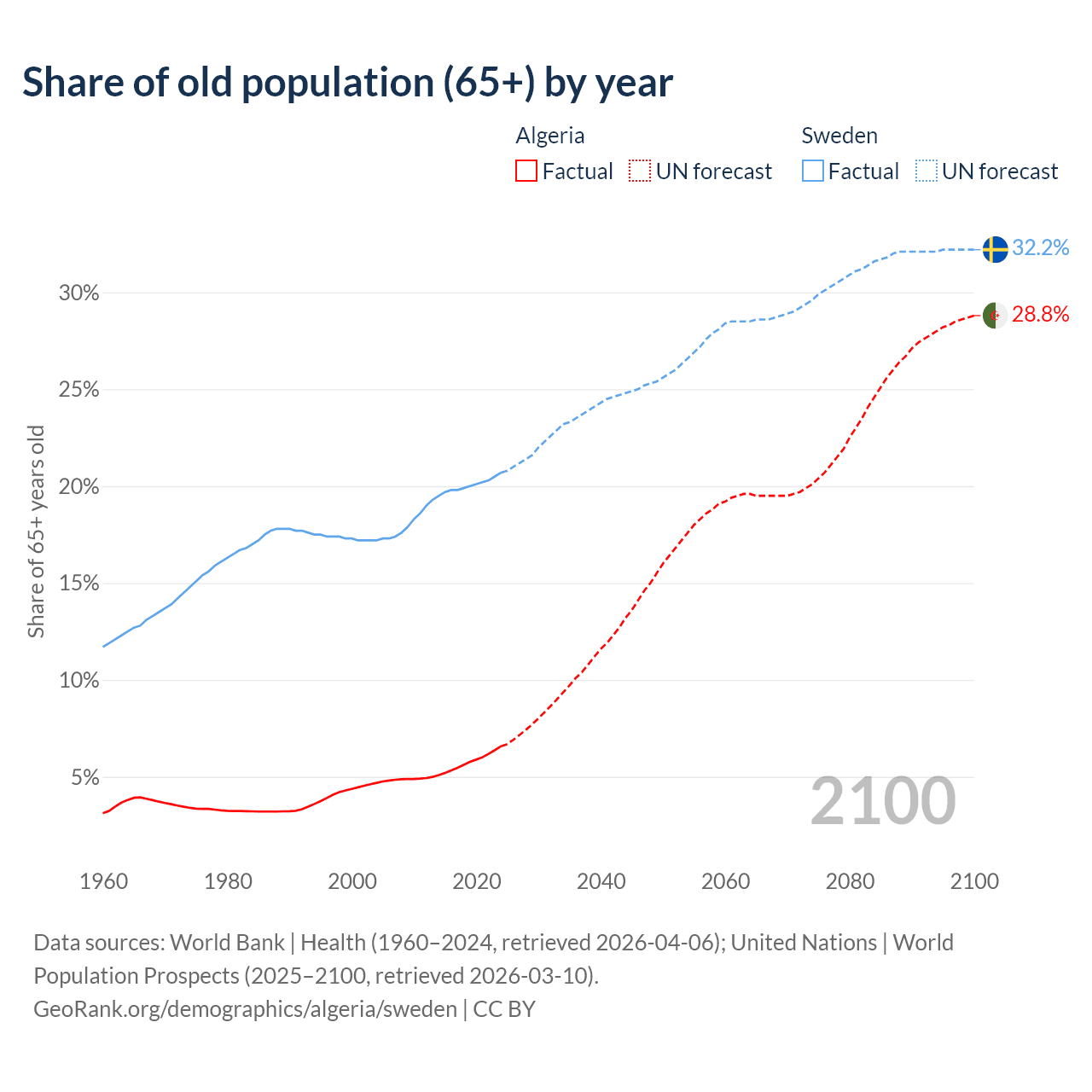 The share of older people aged 65 and over is 6.58% in Algeria and 20.7% in Sweden. Life expectancy in Algeria compared to Sweden .