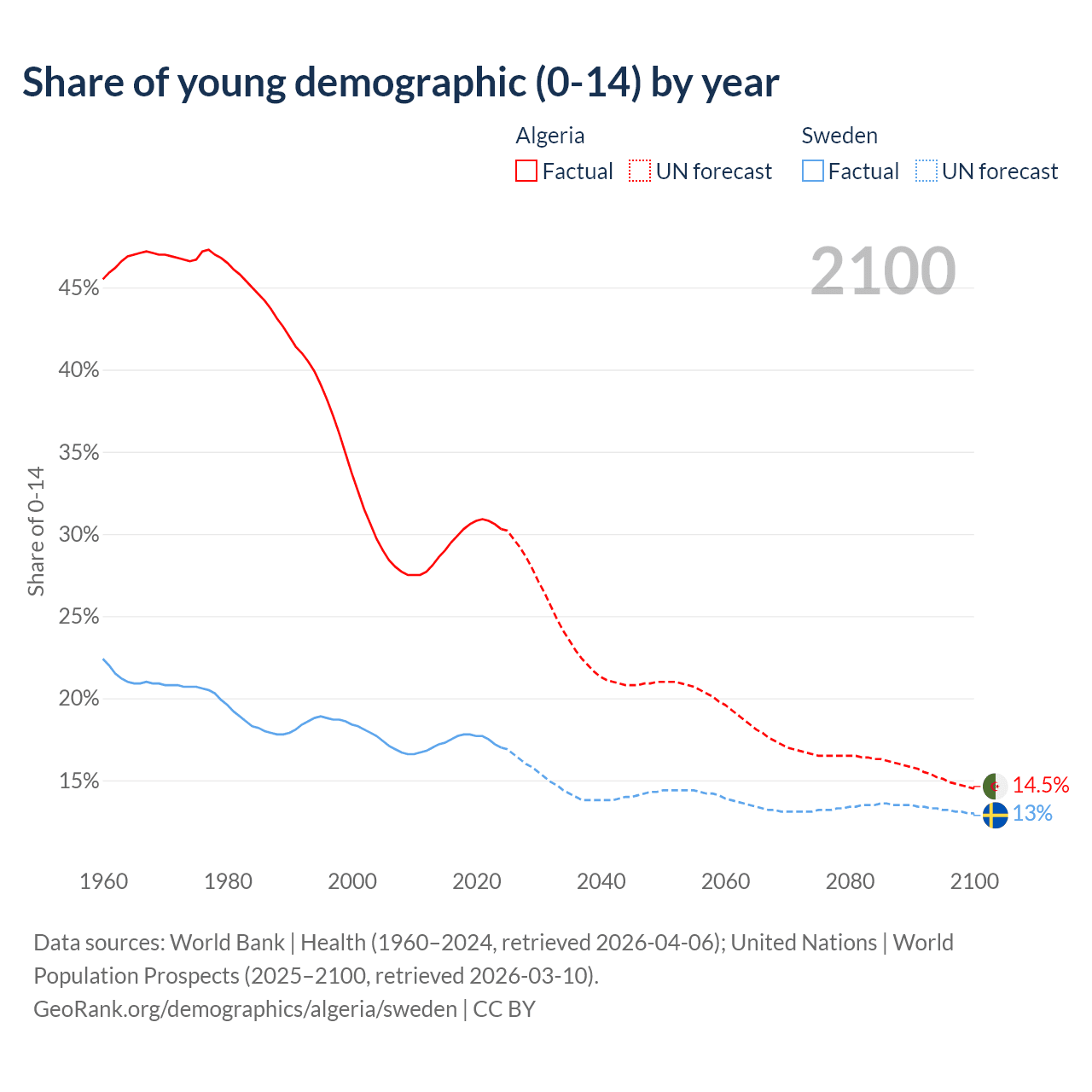 - The share of young demographic (0-15 years old) in Algeria is 30.3% vs 17% in Sweden.