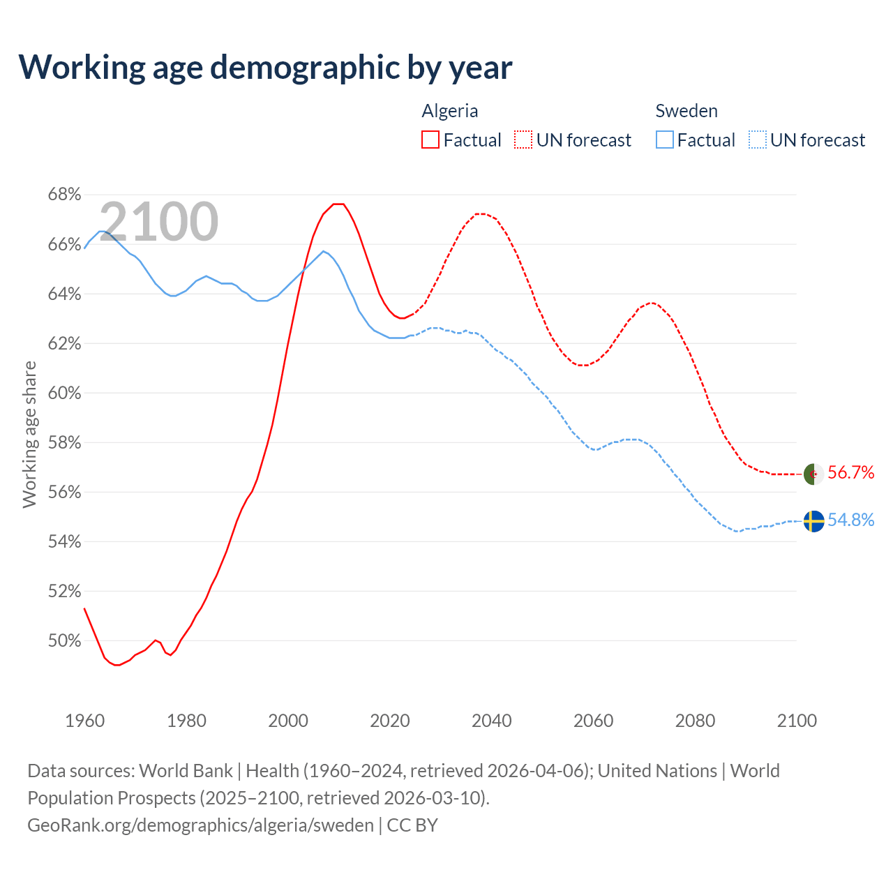 - Algeria has 30.4M working age adults (aged 15-64) vs 6.65M in Sweden.