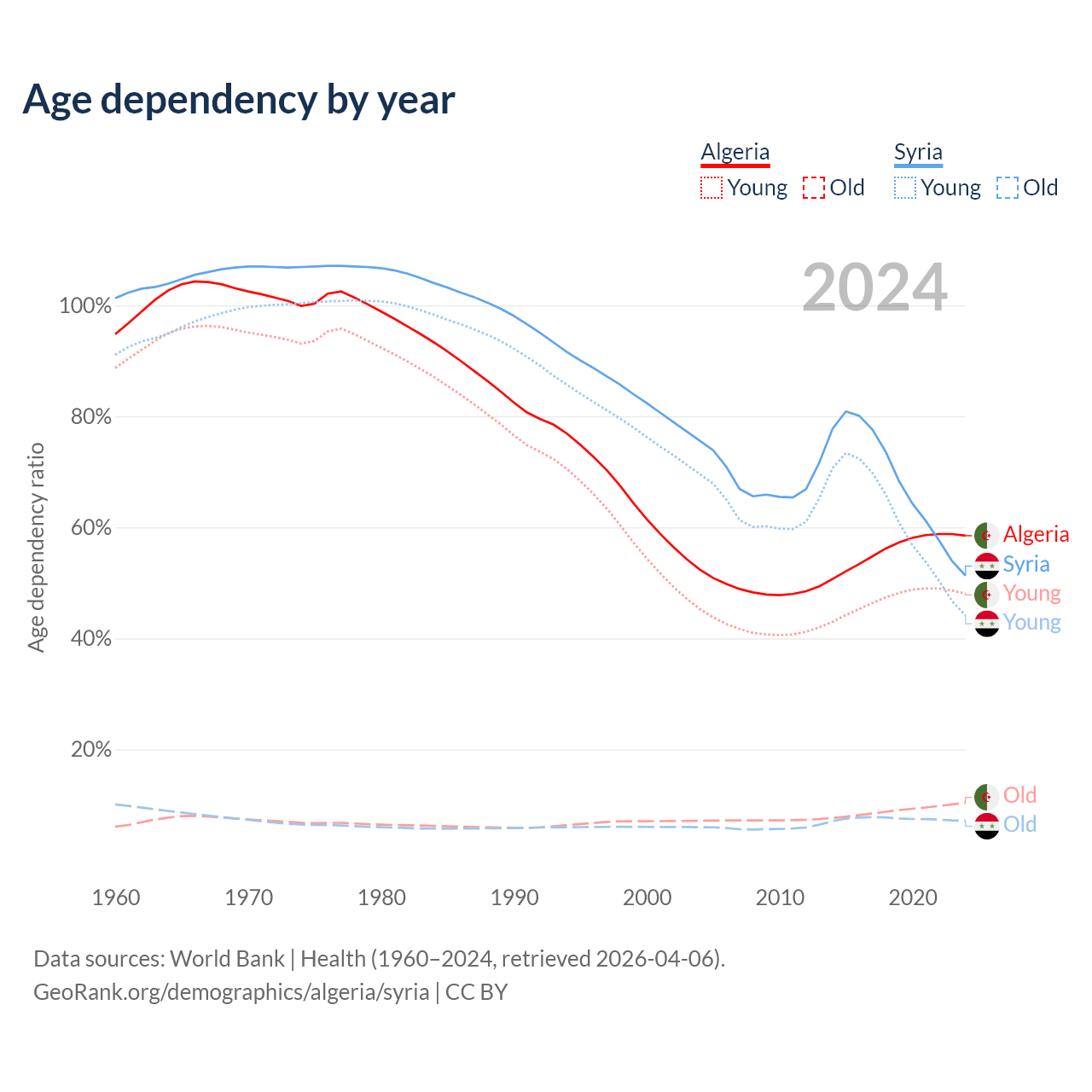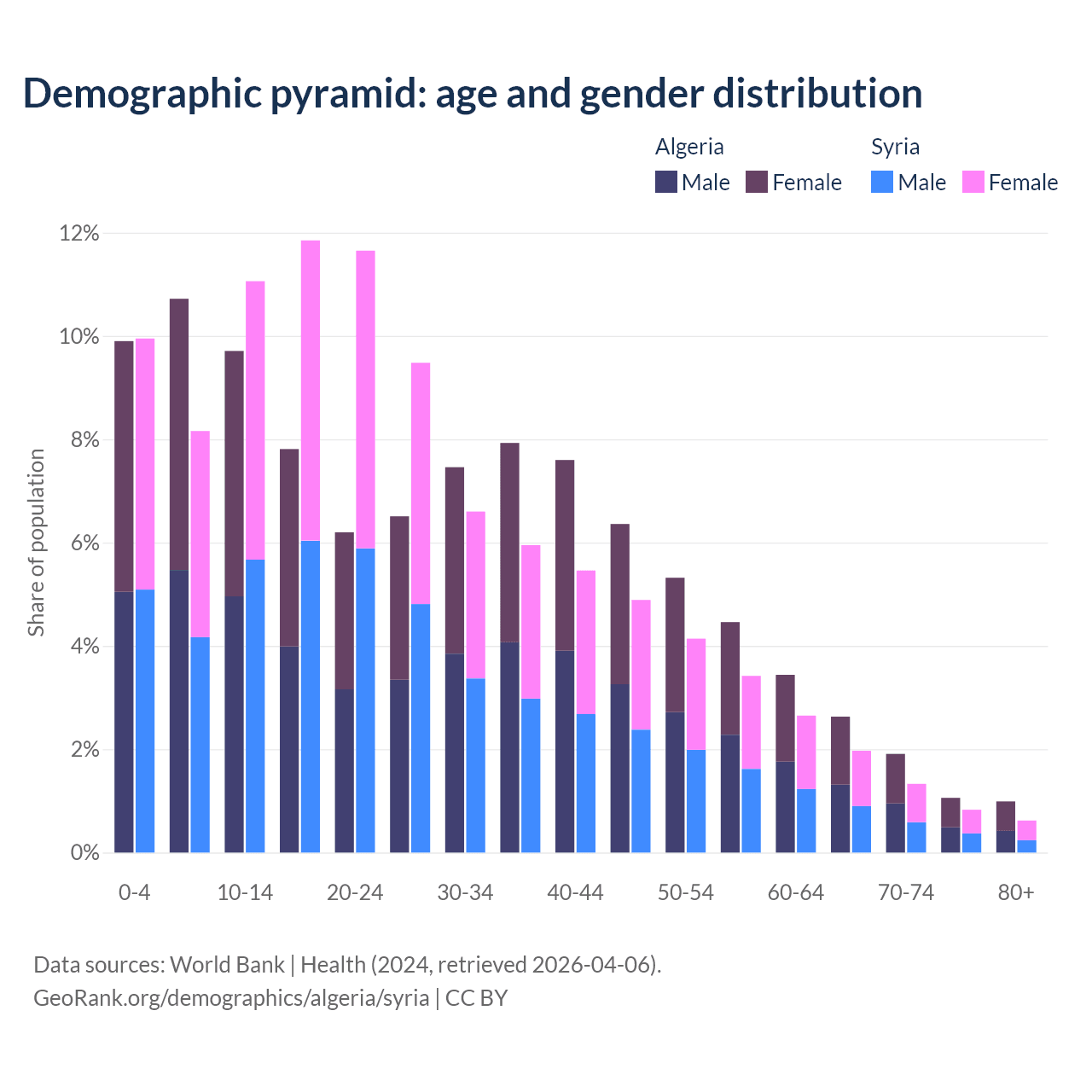 - Algeria is ranked 111/196 by median age (oldest to youngest) vs 138/196 for Syria.