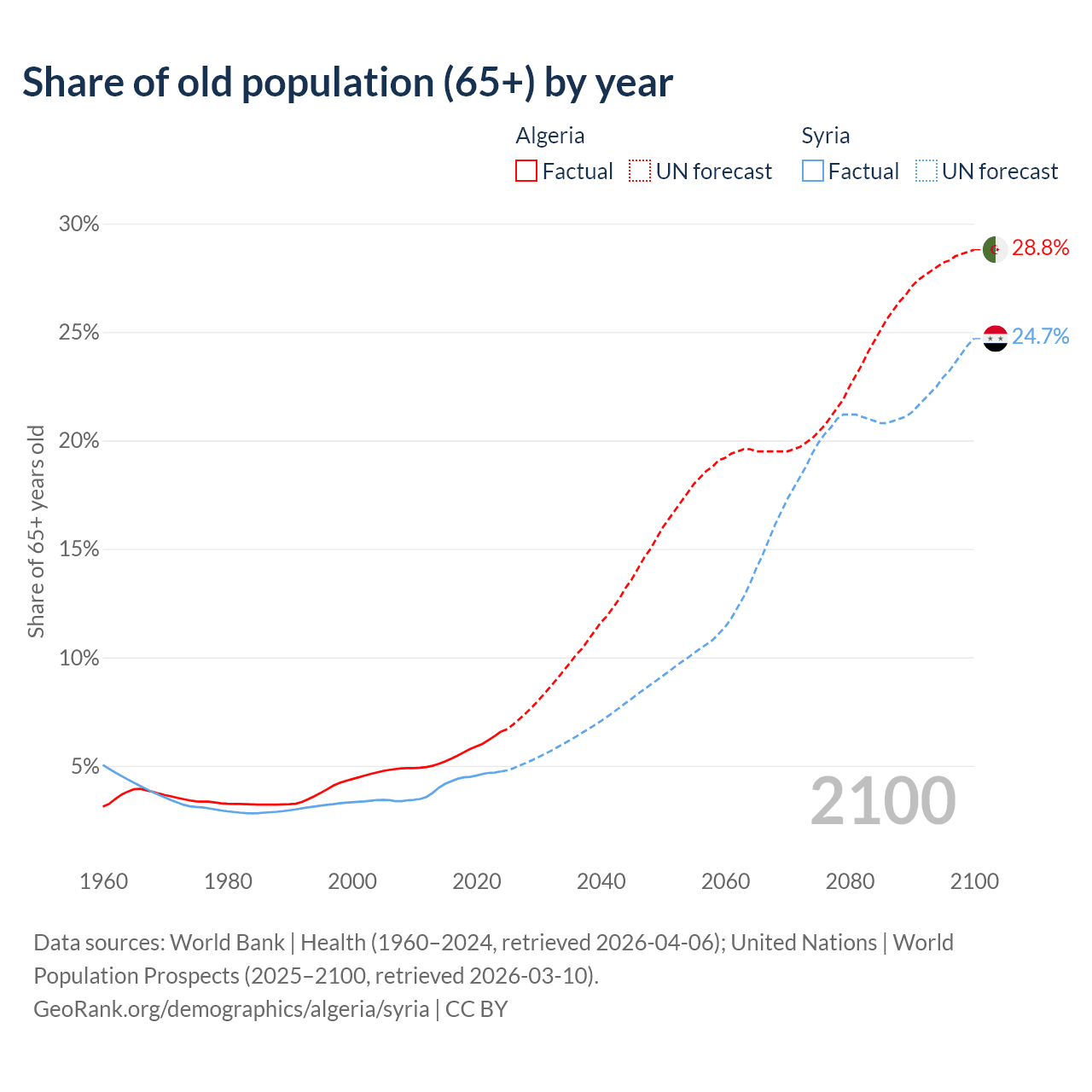 The share of older people aged 65 and over is 6.58% in Algeria and 4.74% in Syria. Life expectancy in Algeria compared to Syria .