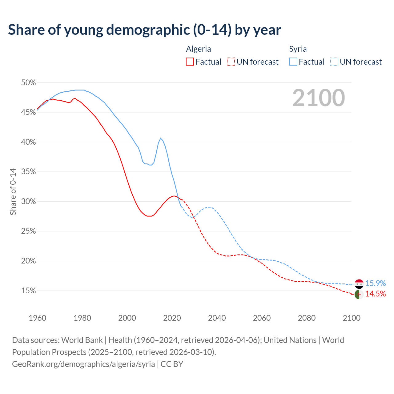 Median age Algeria vs Syria, 1960-2100