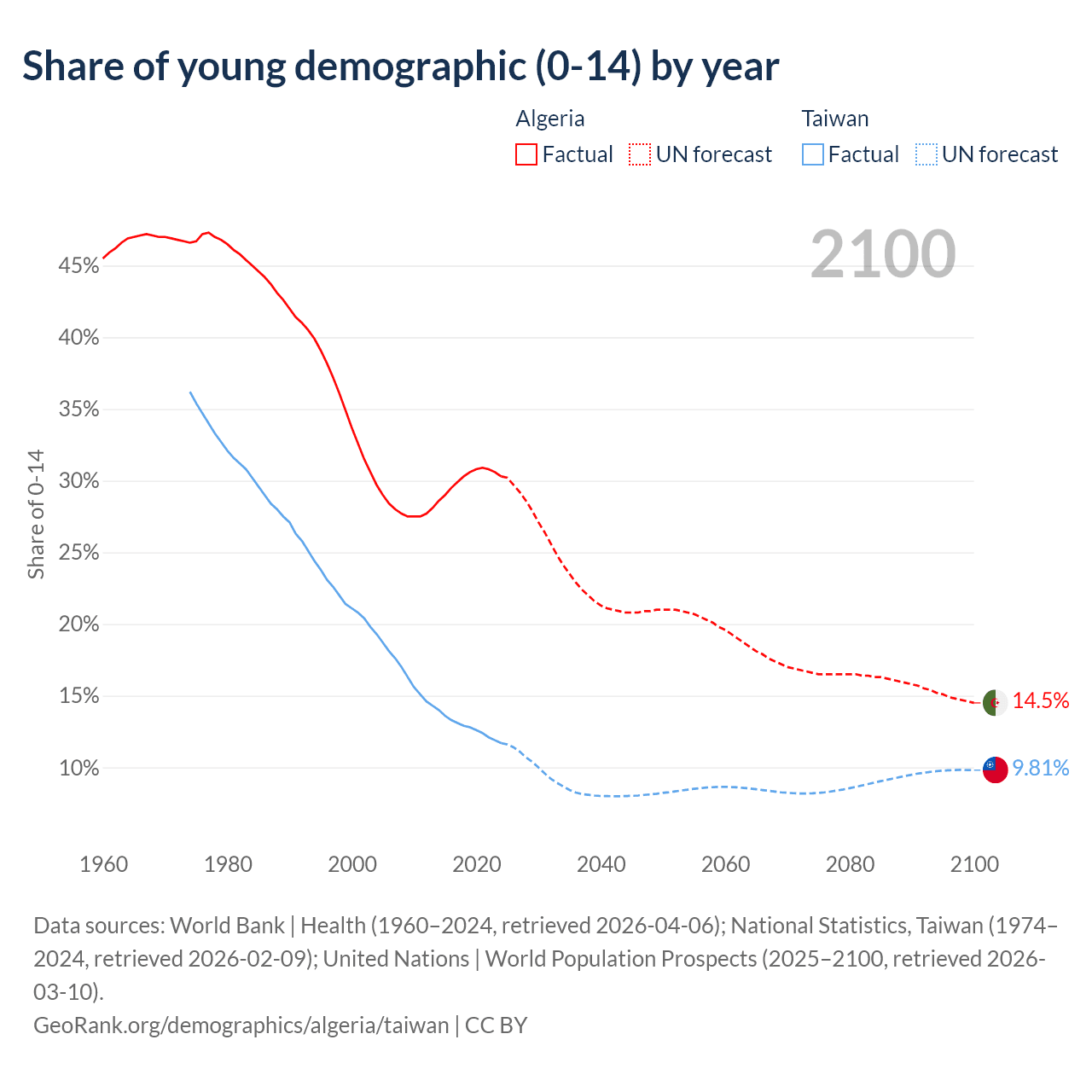 - The share of young demographic (0-15 years old) in Algeria is 30.3% vs 11.7% in Taiwan.