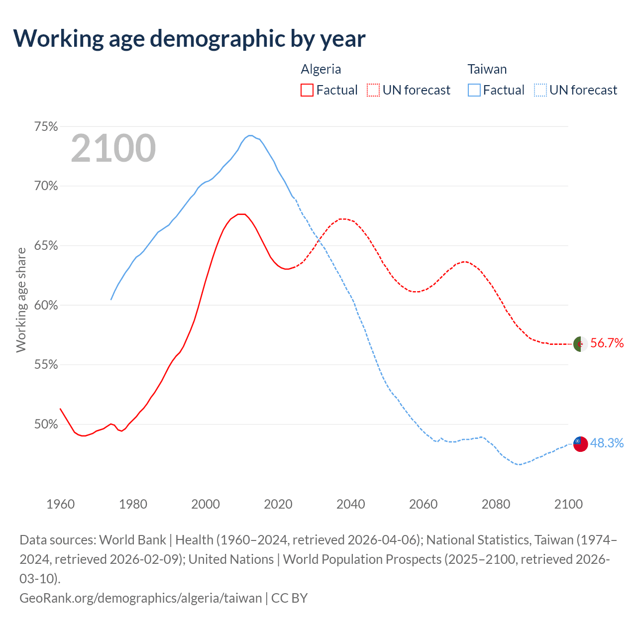 - Algeria has 30.4M working age adults (aged 15-64) vs 16.1M in Taiwan.