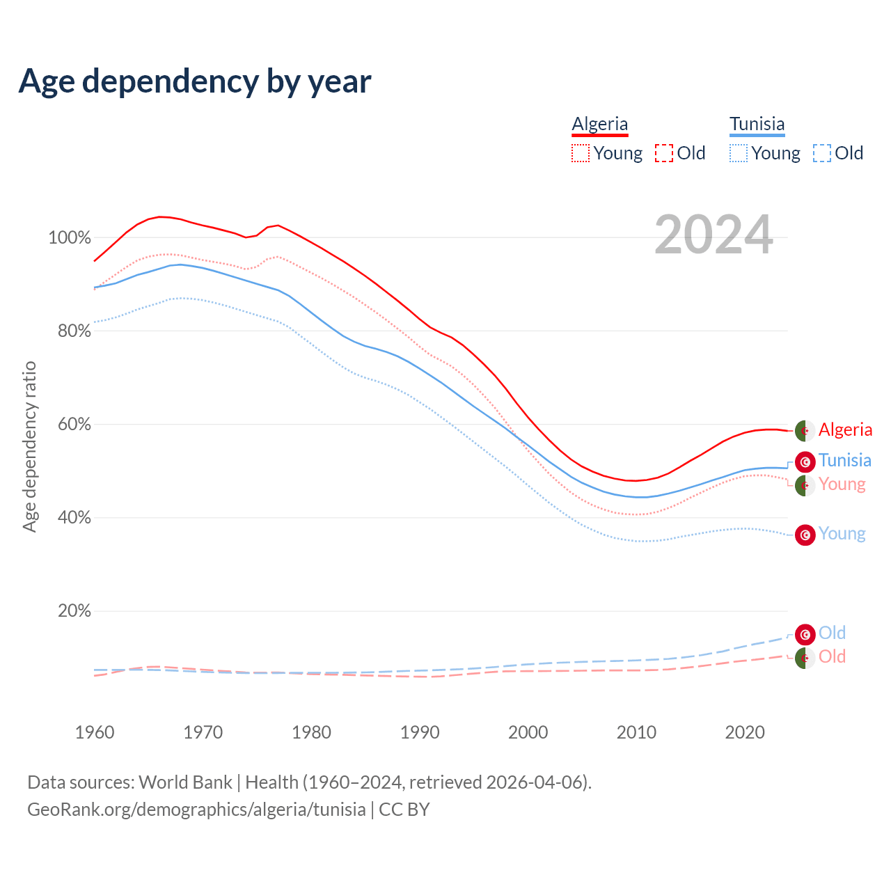 Data sources: World Bank | Health (1960–2024, retrieved 2026-04-06); U.S. Census Bureau (1960–2024, retrieved 2026-02-08).