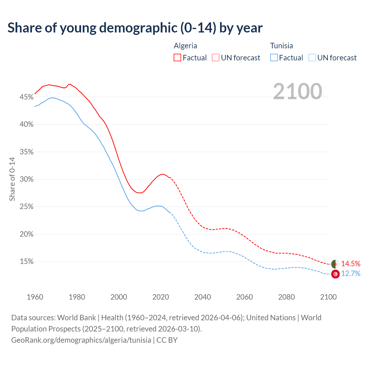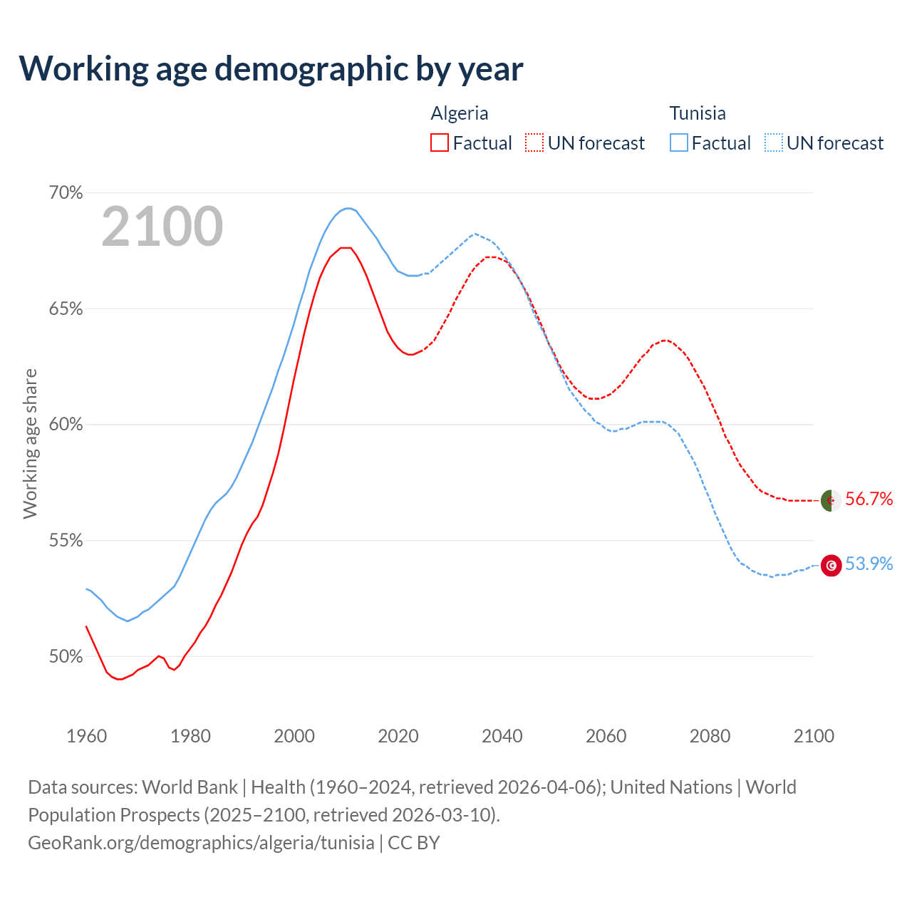 Median age Algeria vs Tunisia, 1960-2100