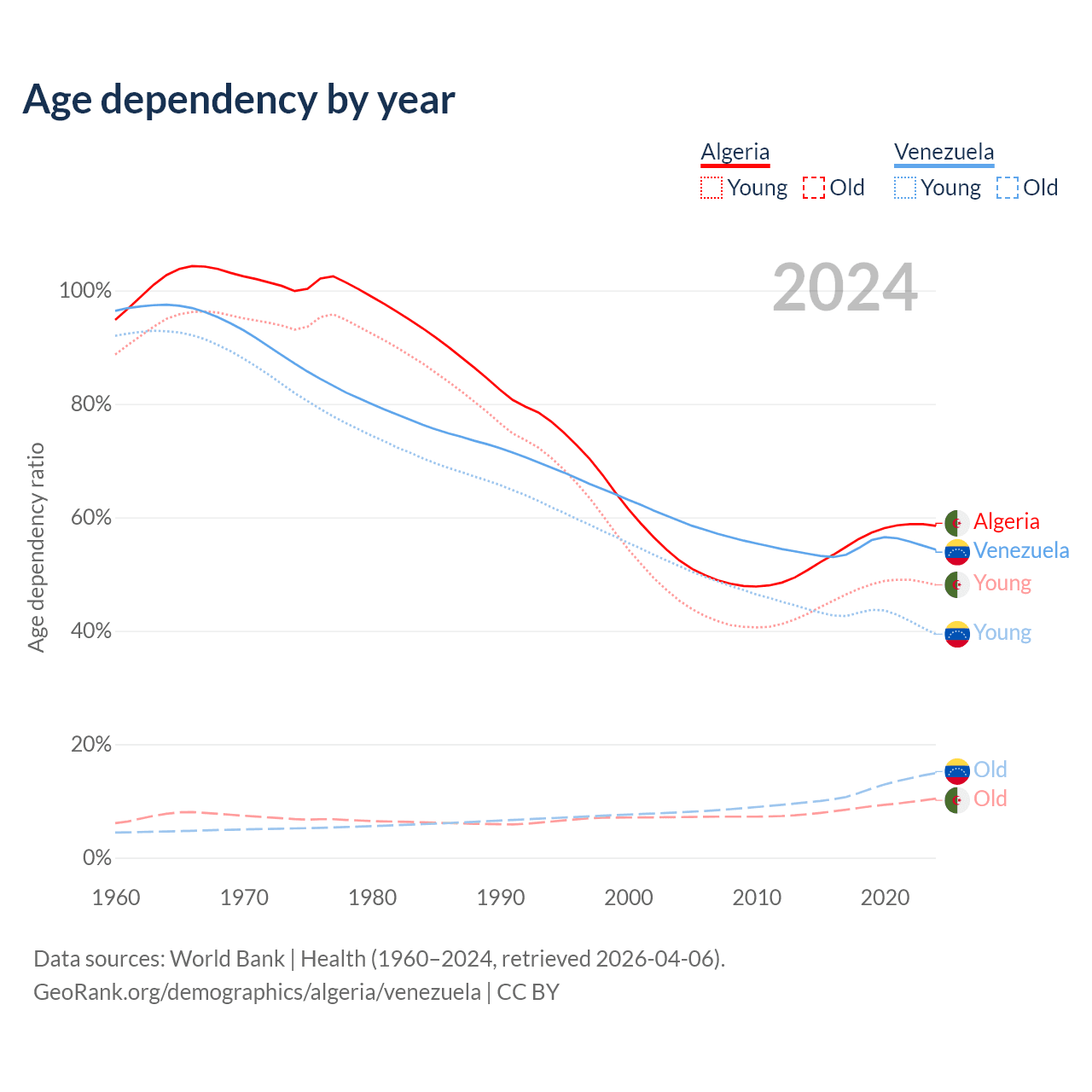 Data sources: World Bank | Health (1960–2024, retrieved 2026-04-06); U.S. Census Bureau (1960–2024, retrieved 2026-02-08).