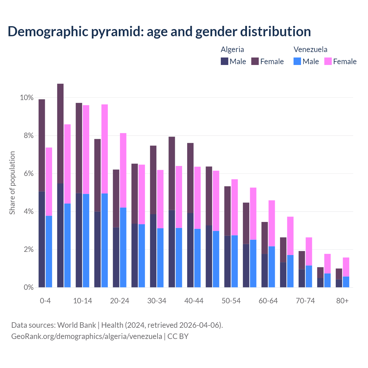 - The share of old-age demographic (65+) in Algeria is 6.58% vs 9.68% in Venezuela.