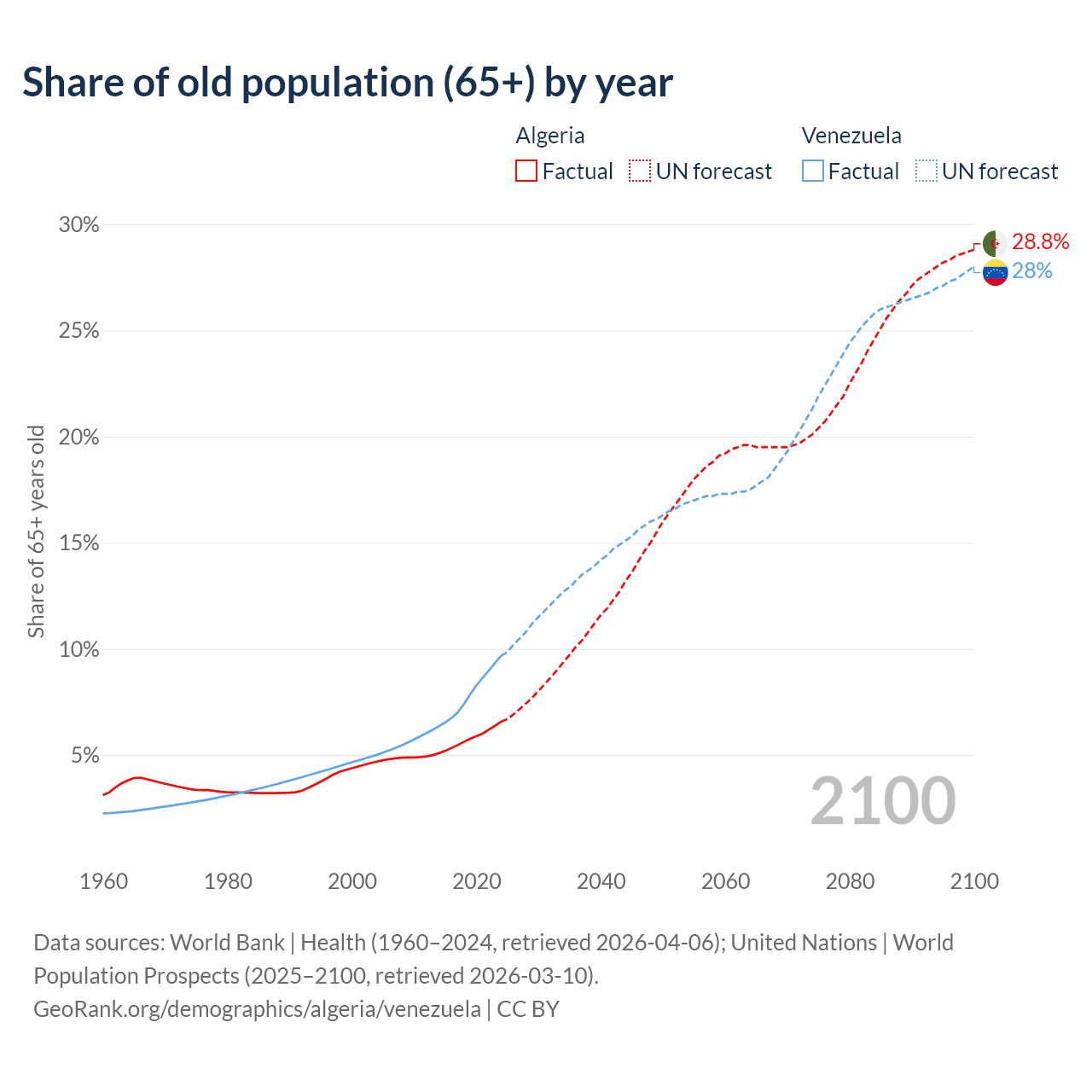 The share of older people aged 65 and over is 6.58% in Algeria and 9.68% in Venezuela. Life expectancy in Algeria compared to Venezuela .