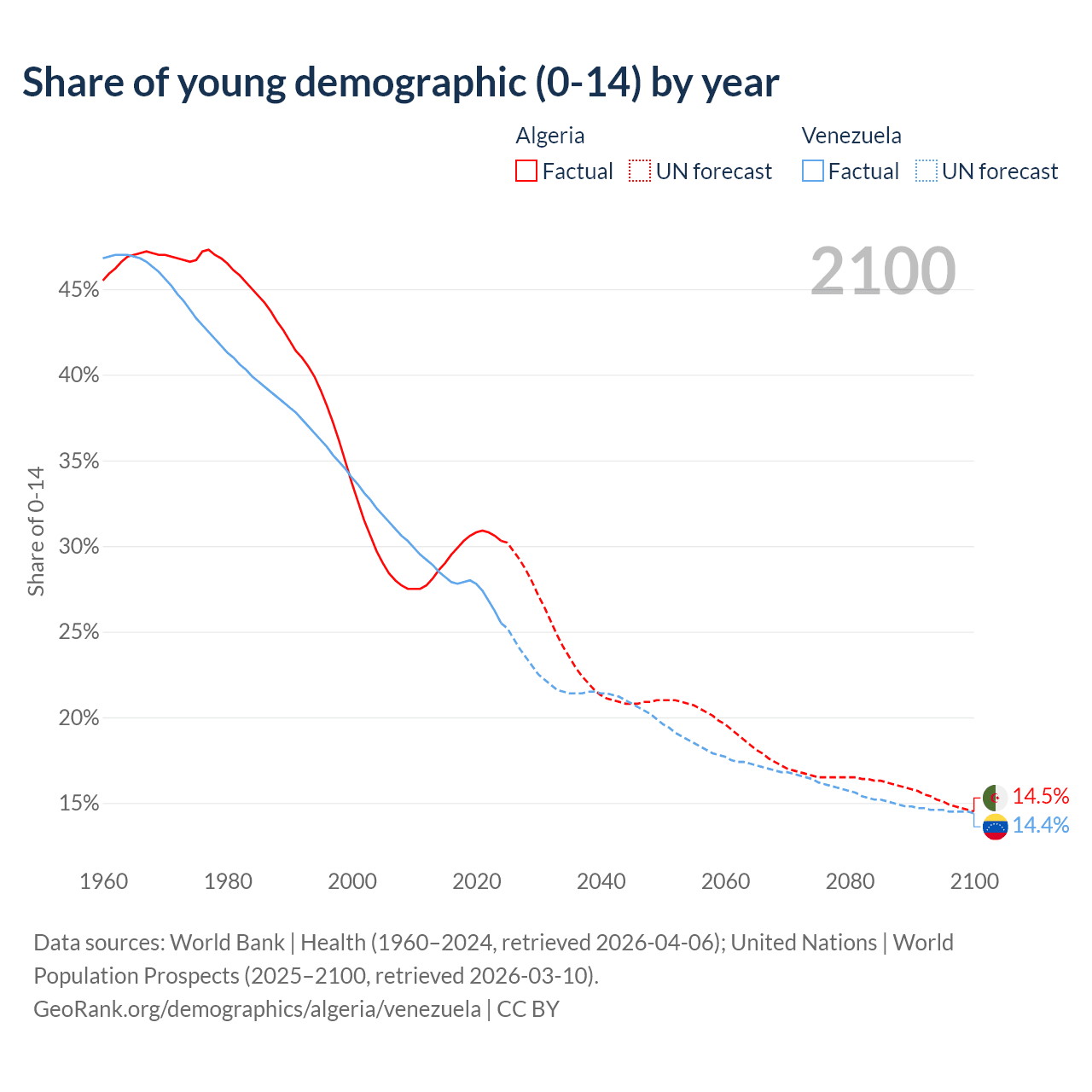- The share of young demographic (0-15 years old) in Algeria is 30.3% vs 25.5% in Venezuela.