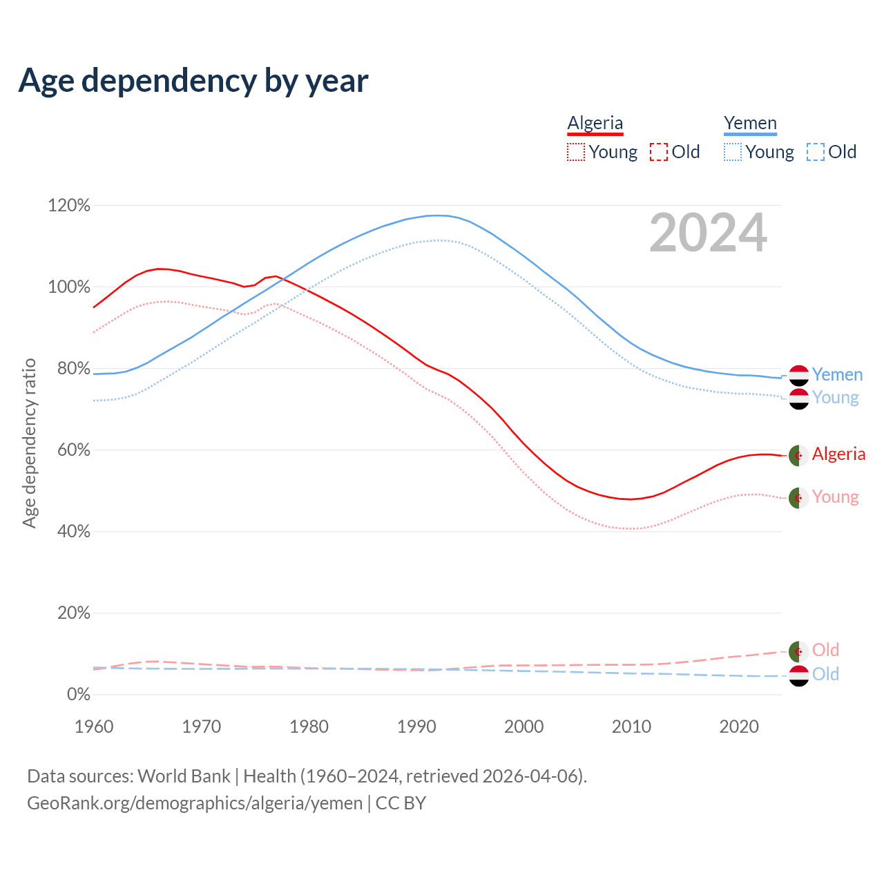 - The share of old-age demographic (65+) in Algeria is 6.58% vs 2.52% in Yemen.