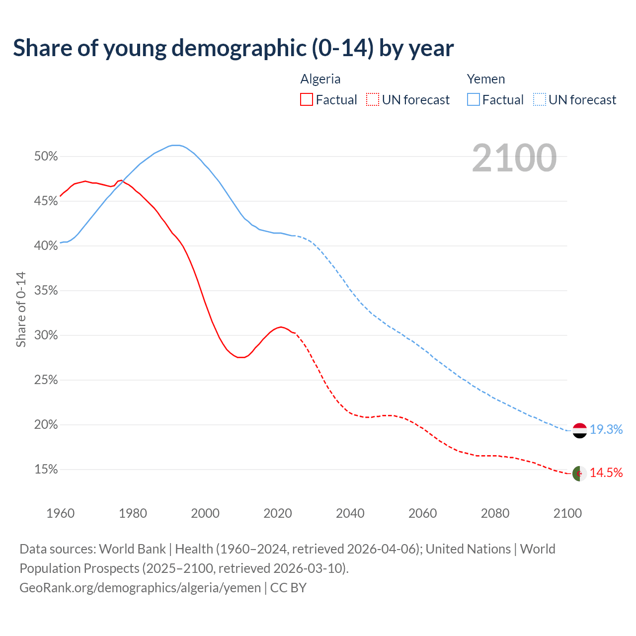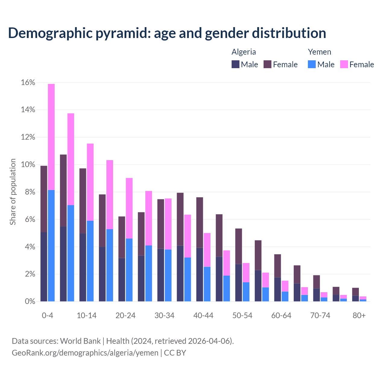 - Algeria is ranked 111/196 by median age (oldest to youngest) vs 174/196 for Yemen.