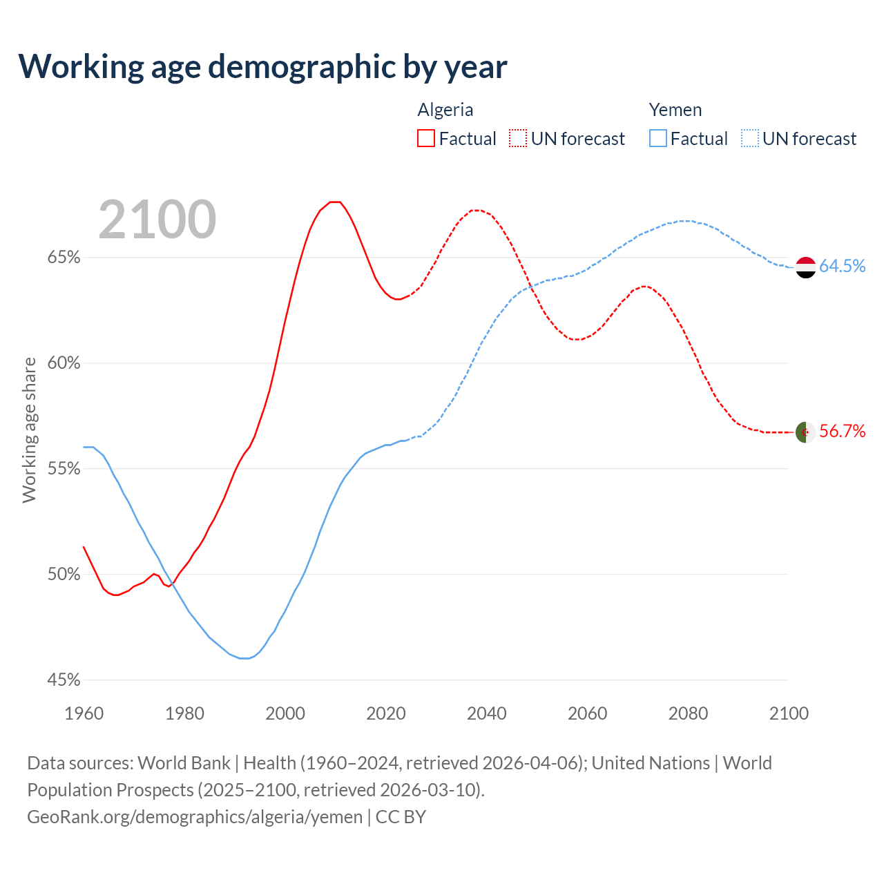 - Algeria has 30.4M working age adults (aged 15-64) vs 24.4M in Yemen.