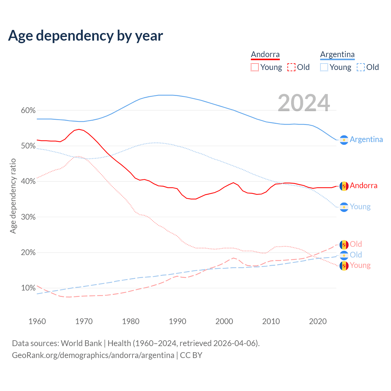 - Andorra is ranked 18/196 by median age (oldest to youngest) vs 85/196 for Argentina.