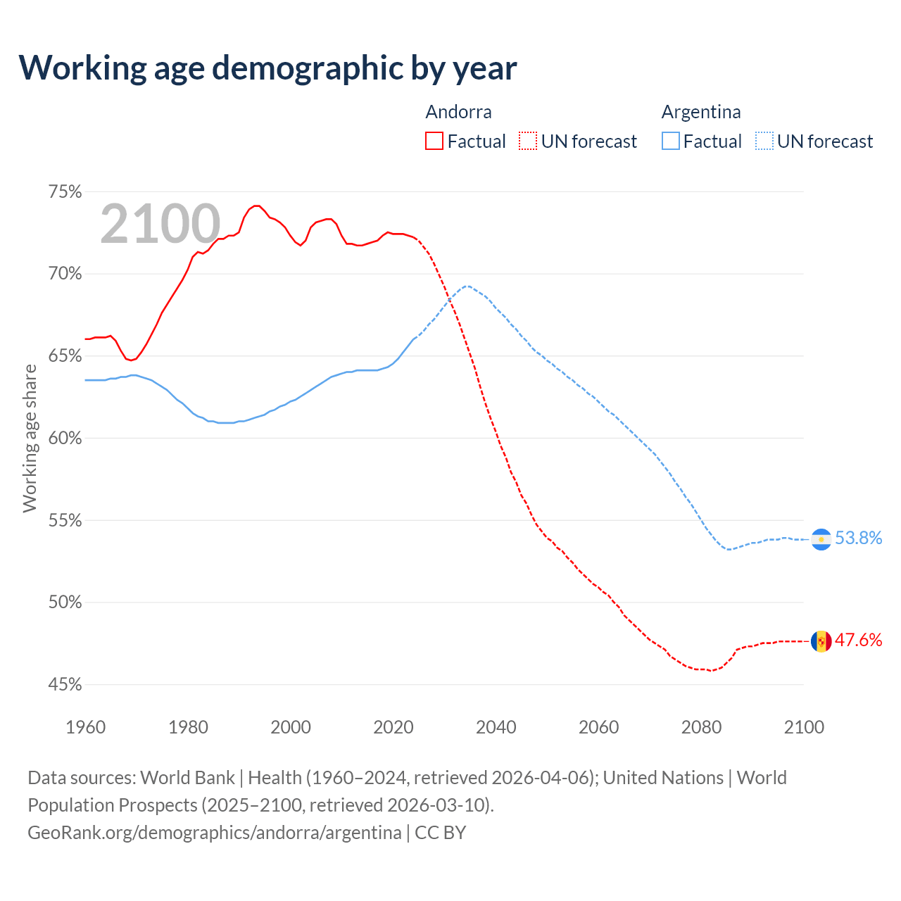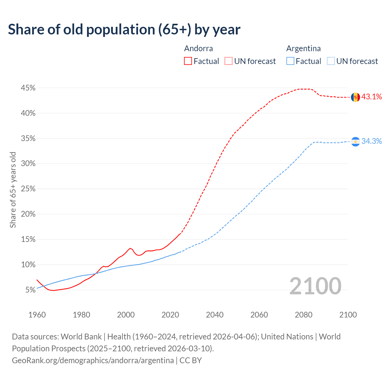Median age Andorra vs Argentina, 1960-2100