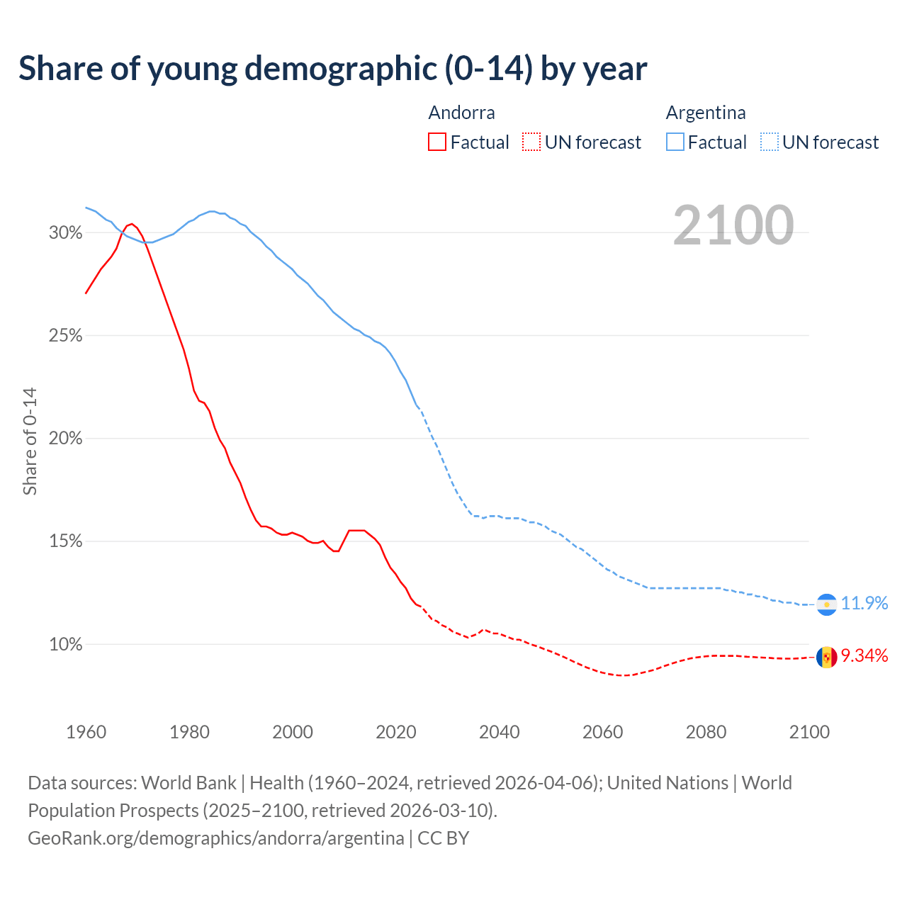 - The share of young demographic (0-15 years old) in Andorra is 11.9% vs 21.6% in Argentina.