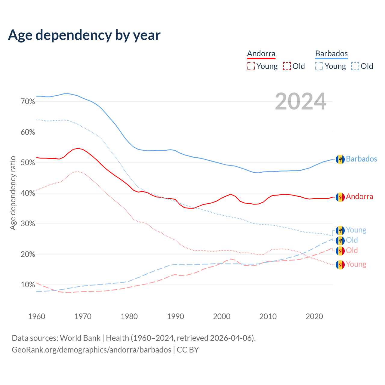 - Andorra is ranked 18/196 by median age (oldest to youngest) vs 47/196 for Barbados.
