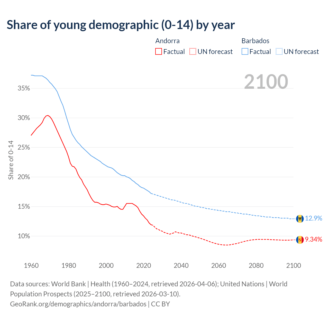 - The share of young demographic (0-15 years old) in Andorra is 11.9% vs 17.2% in Barbados.