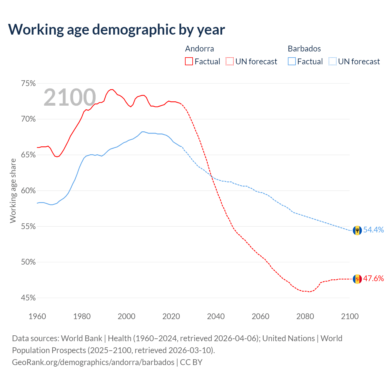 Median age Andorra vs Barbados, 1960-2100