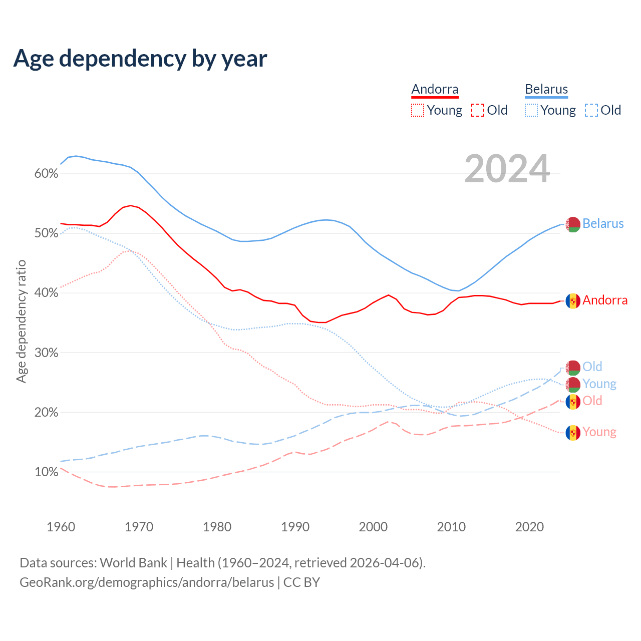 - Andorra is ranked 18/196 by median age (oldest to youngest) vs 35/196 for Belarus.