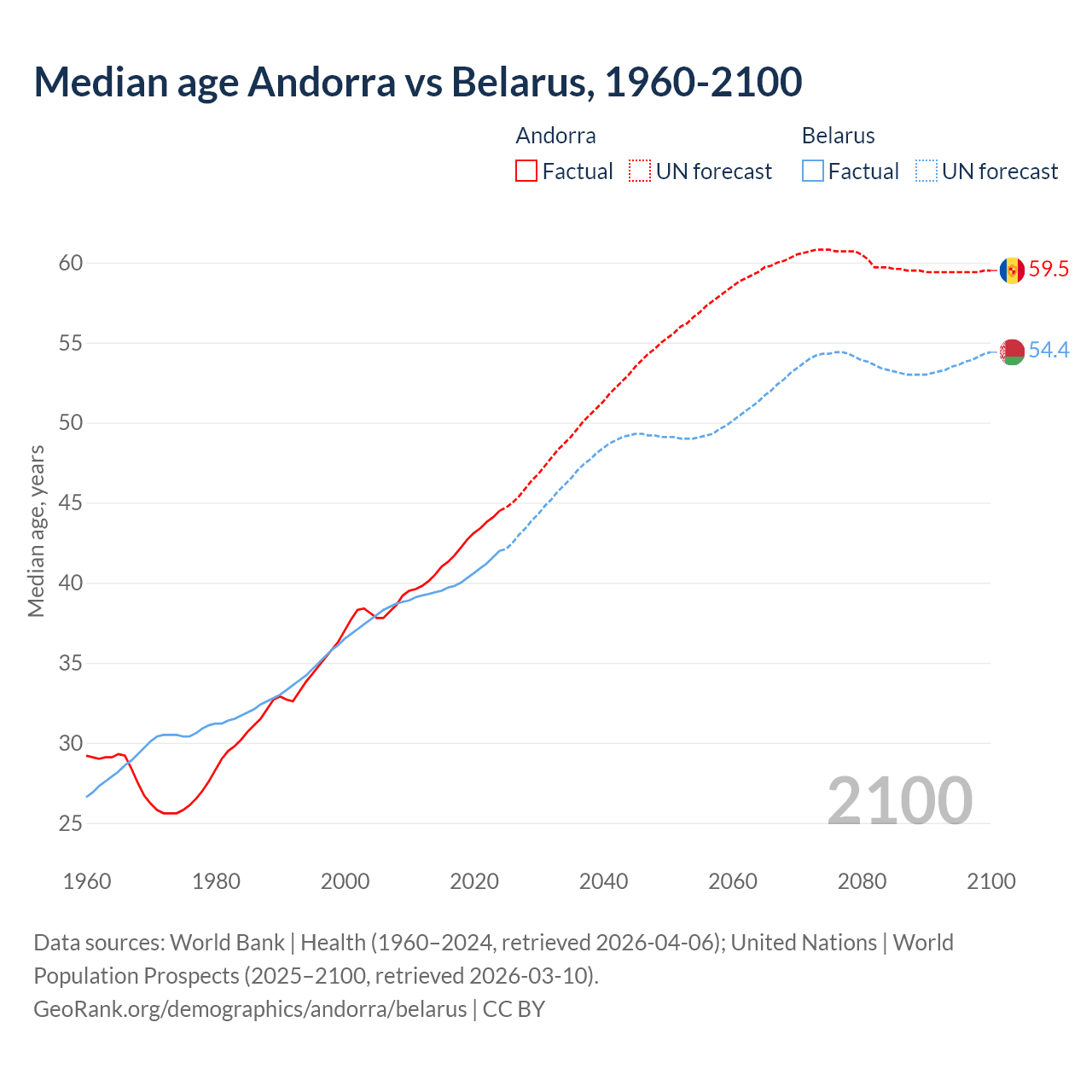 Median age Andorra vs Belarus, 1960-2100