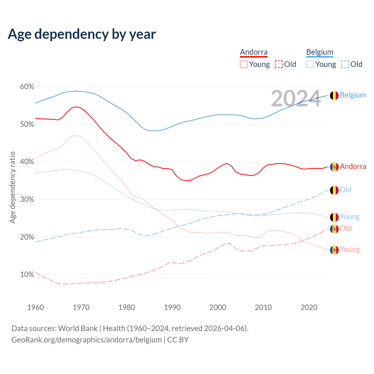 - Andorra is ranked 18/196 by median age (oldest to youngest) vs 32/196 for Belgium.