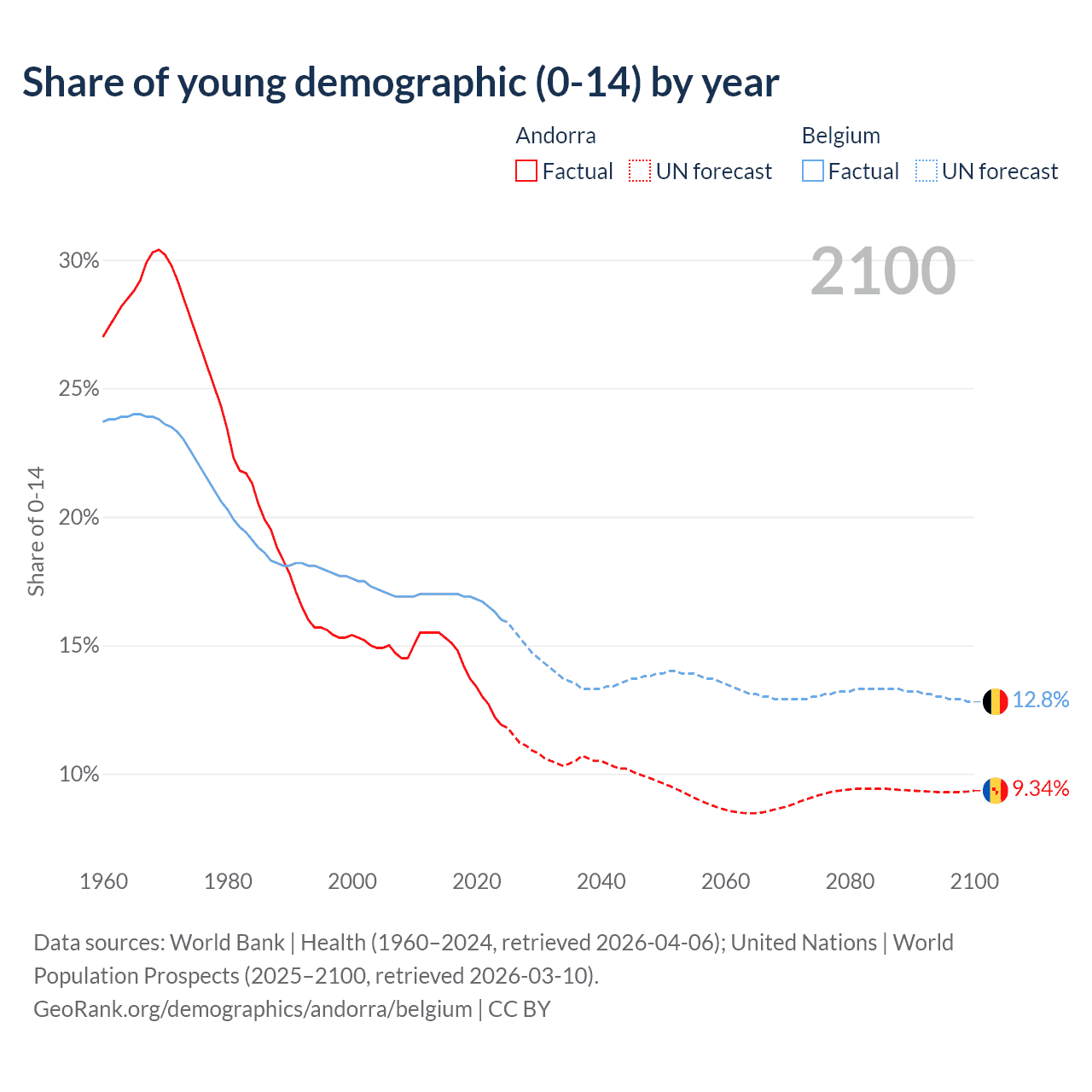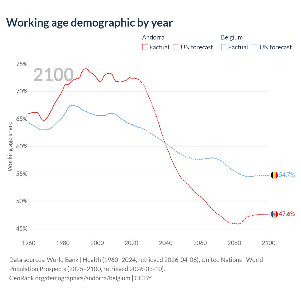 Median age Andorra vs Belgium, 1960-2100