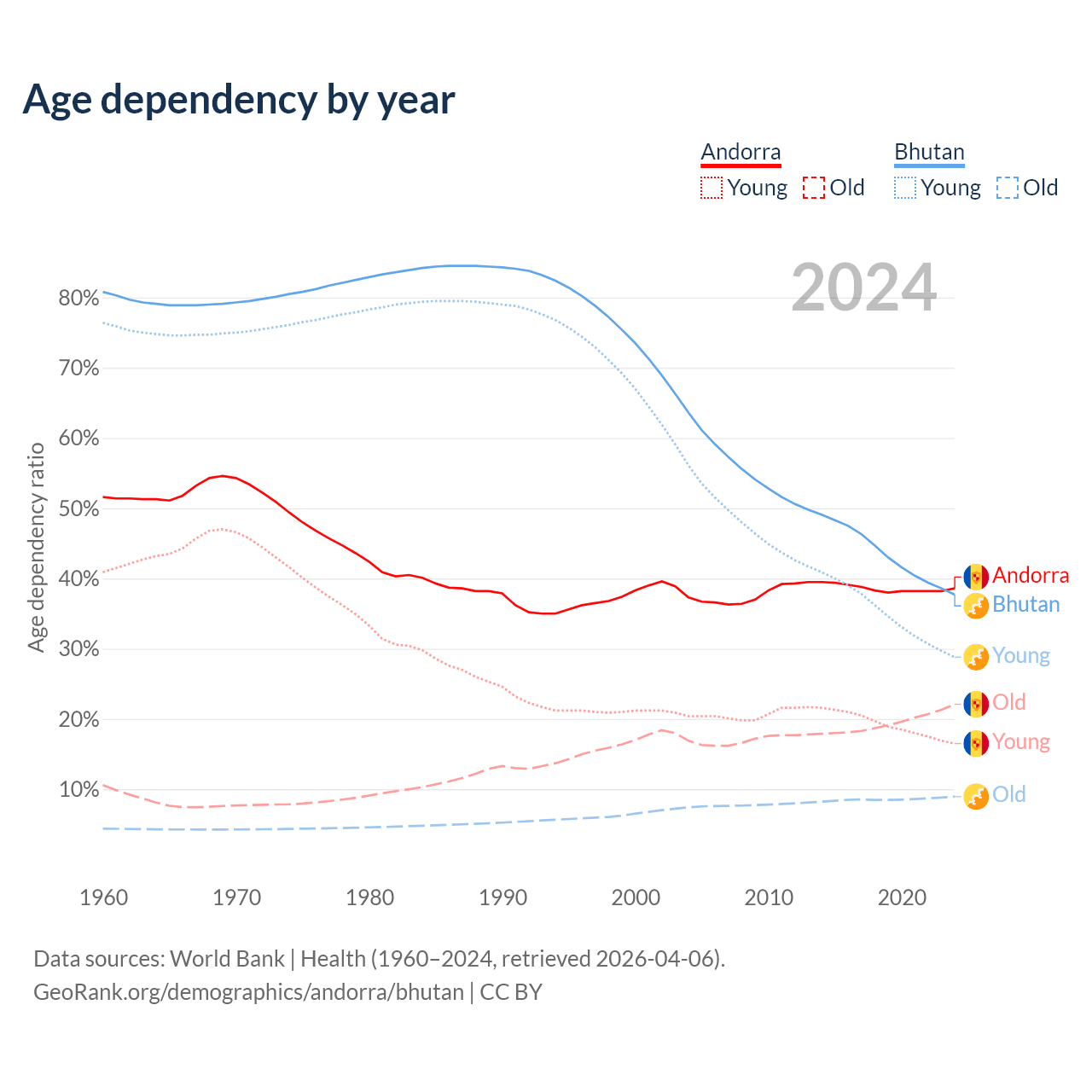 - The share of old-age demographic (65+) in Andorra is 15.9% vs 6.49% in Bhutan.