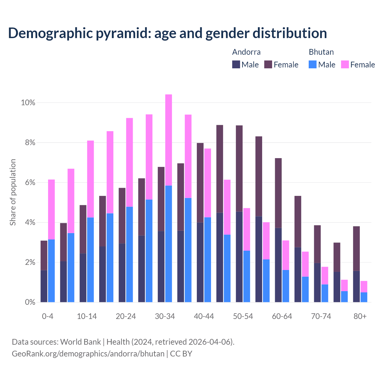 - Andorra is ranked 18/196 by median age (oldest to youngest) vs 95/196 for Bhutan.