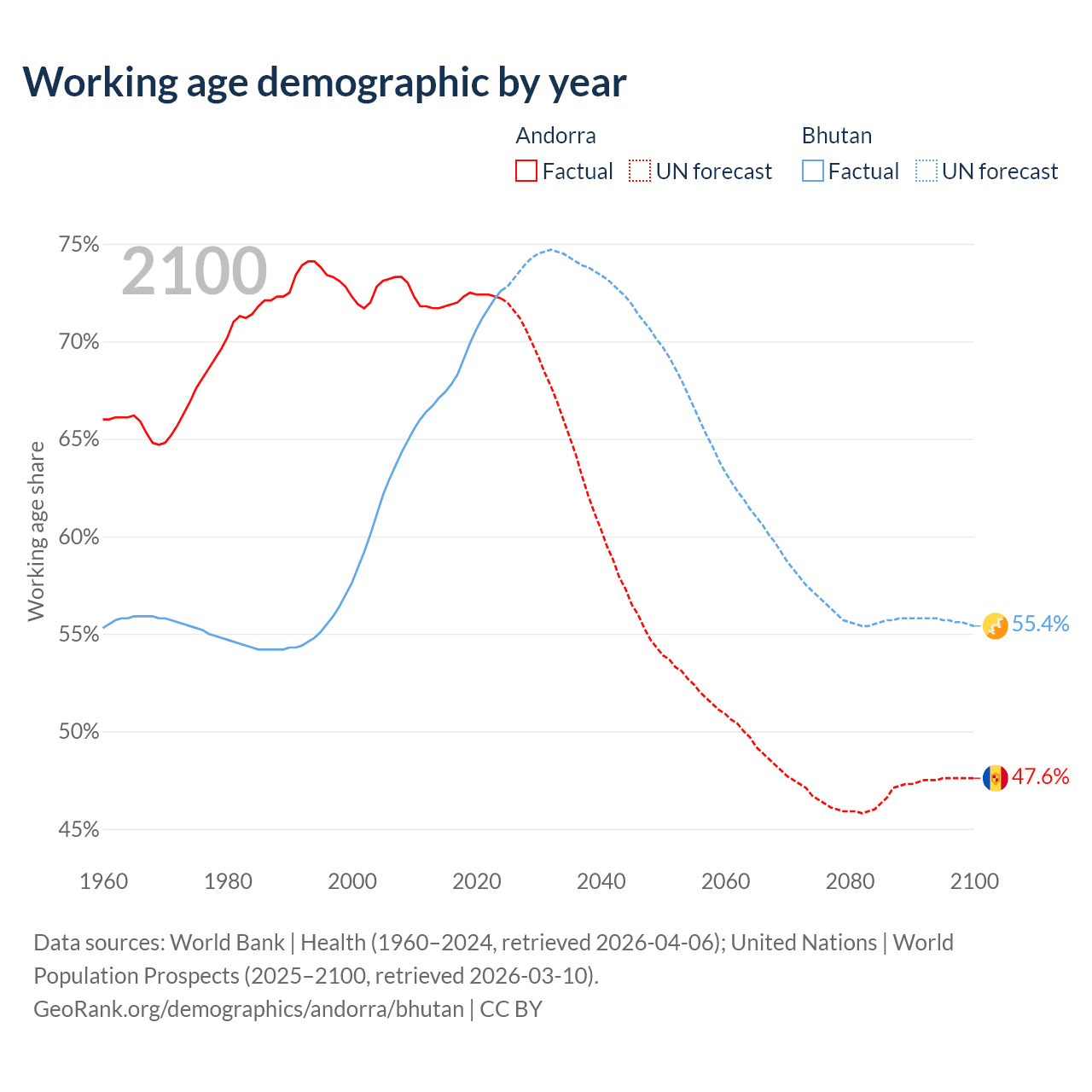 - Andorra has 60.7K working age adults (aged 15-64) vs 583K in Bhutan.