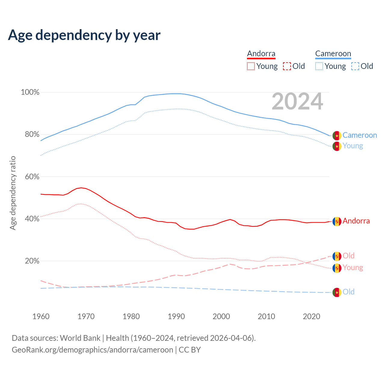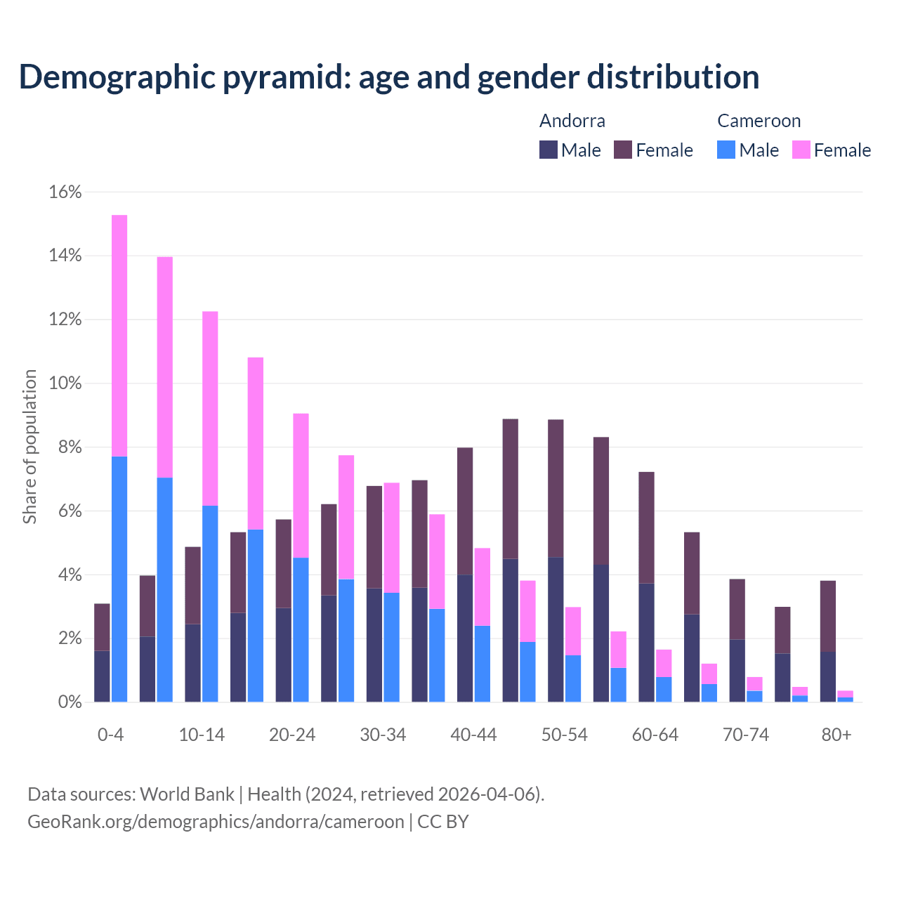 - The share of old-age demographic (65+) in Andorra is 15.9% vs 2.79% in Cameroon.