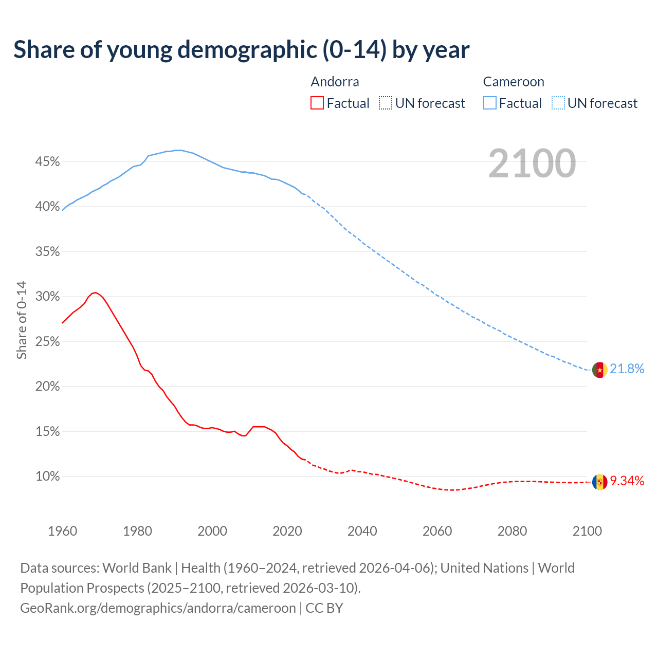 - The share of young demographic (0-15 years old) in Andorra is 11.9% vs 41.4% in Cameroon.
