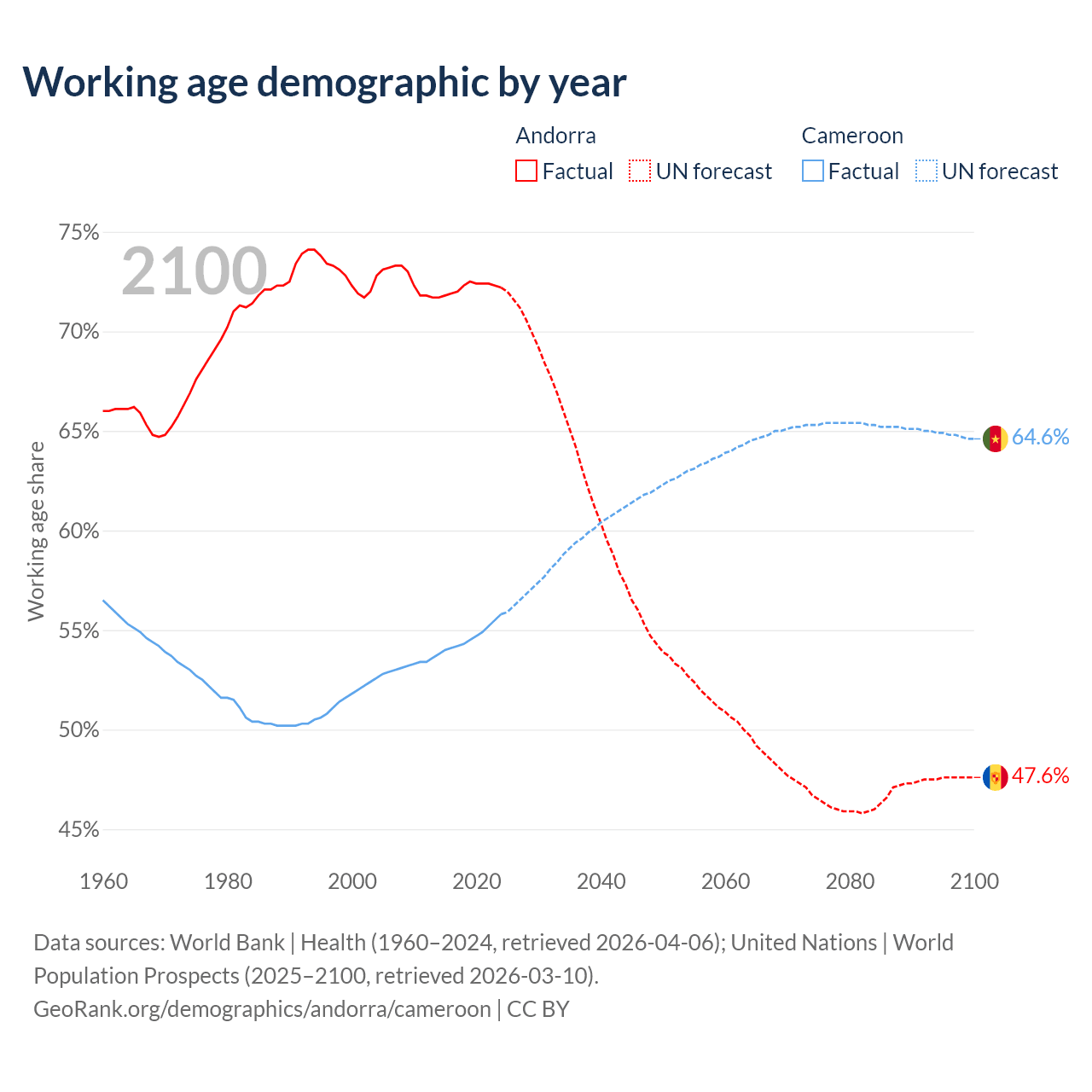 Median age Andorra vs Cameroon, 1960-2100