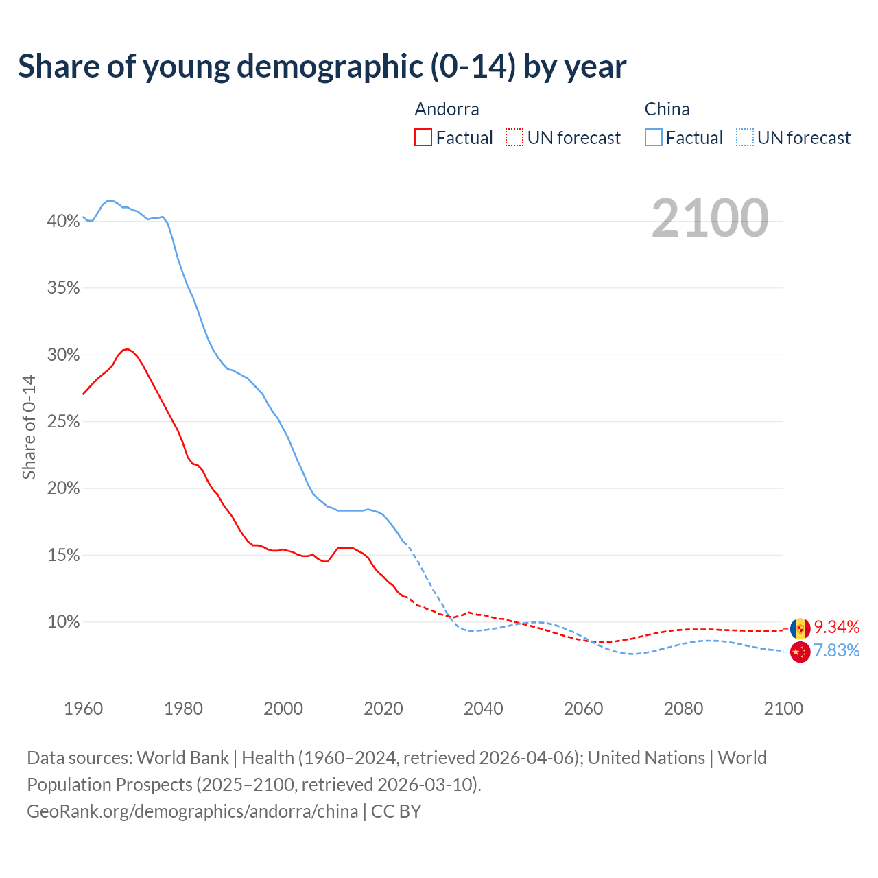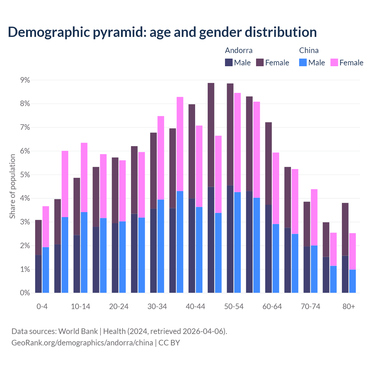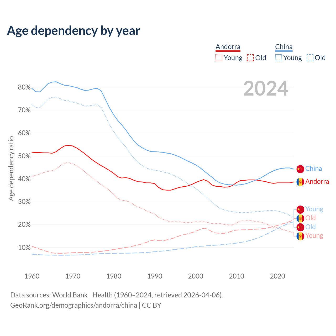 - Andorra is ranked 18/196 by median age (oldest to youngest) vs 44/196 for China.