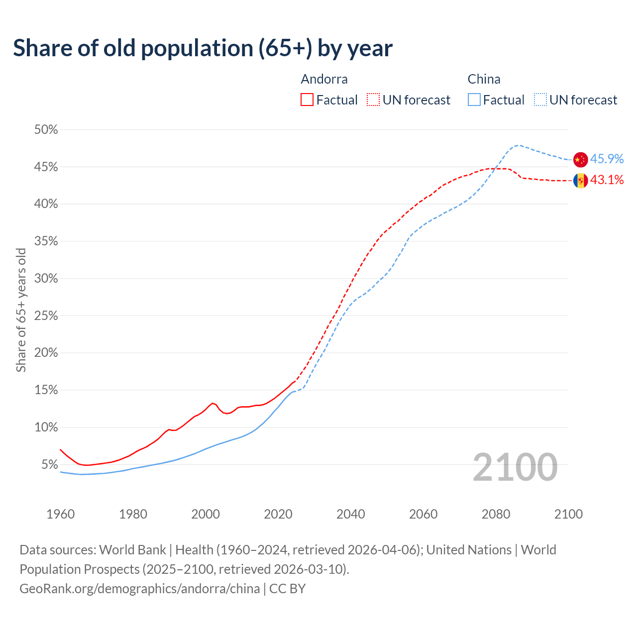 The share of older people aged 65 and over is 15.9% in Andorra and 14.7% in China. Life expectancy in Andorra compared to China .