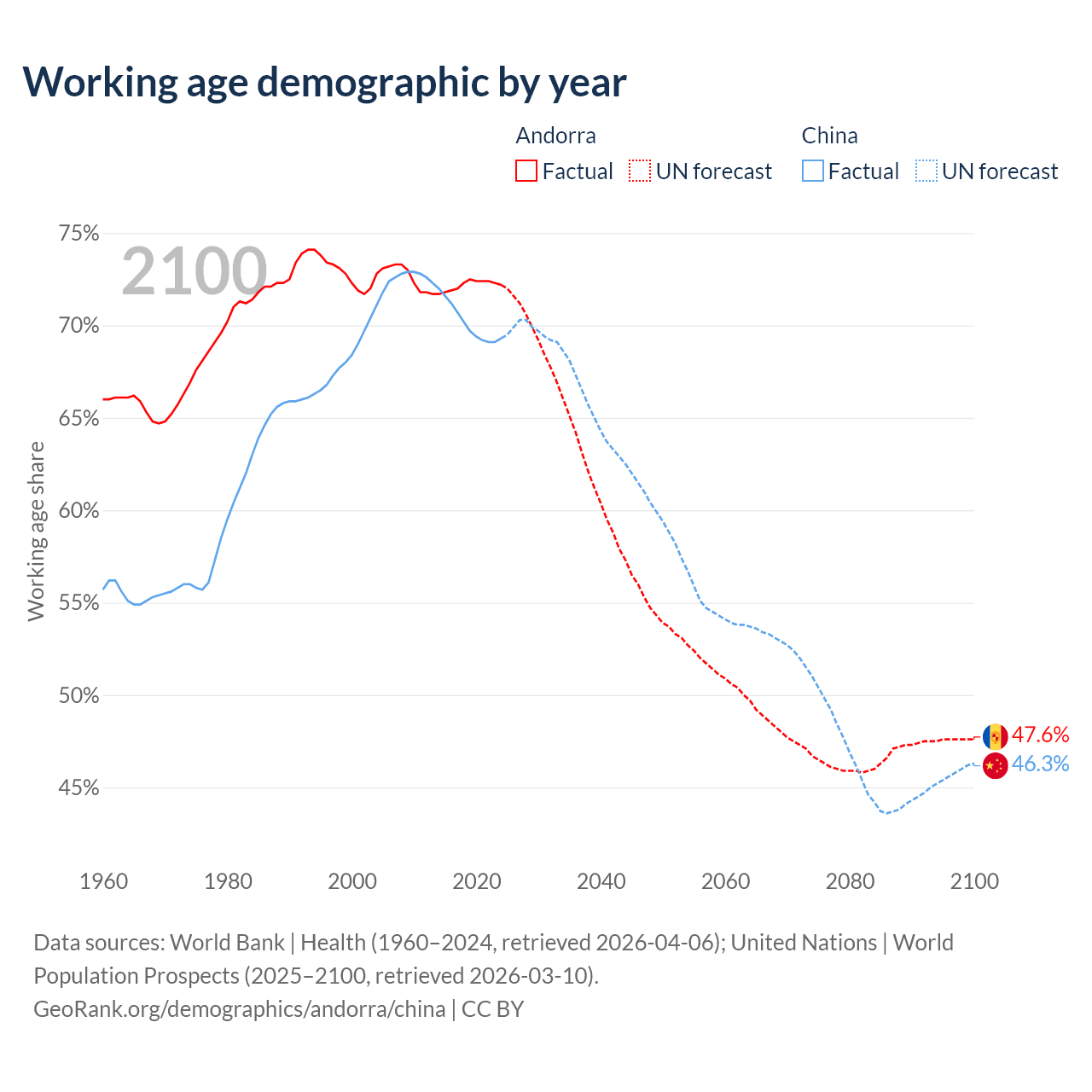 - Andorra has 60.7K working age adults (aged 15-64) vs 972M in China.