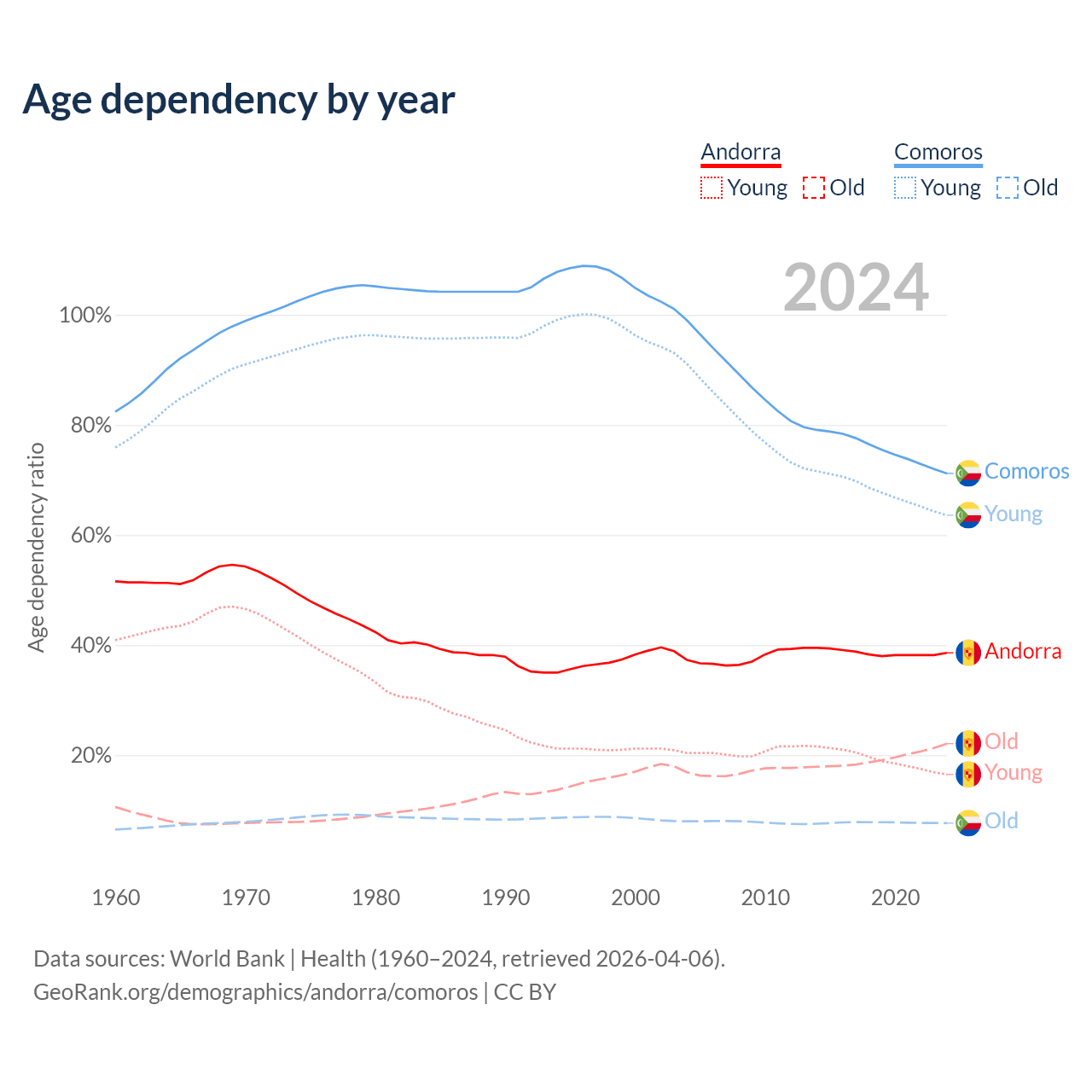 - Andorra is ranked 18/196 by median age (oldest to youngest) vs 152/196 for Comoros.