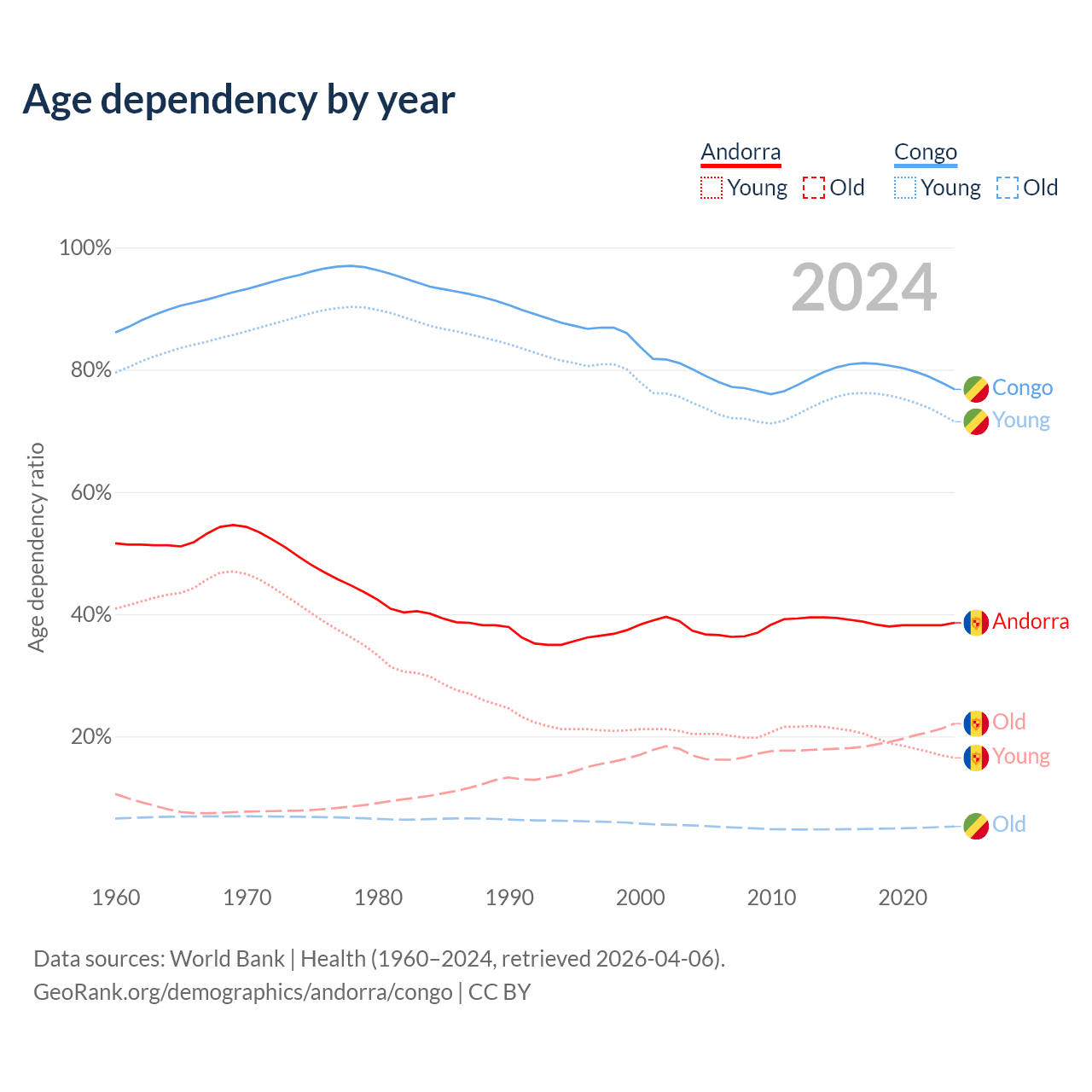 - Andorra is ranked 18/196 by median age (oldest to youngest) vs 170/196 for the Congo.
