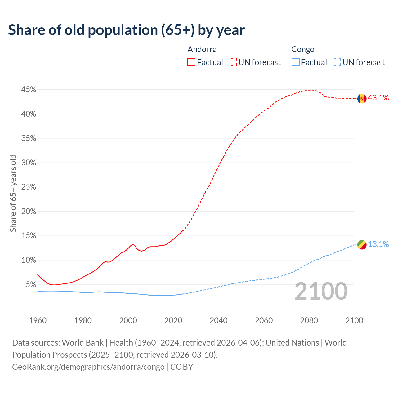The share of older people aged 65 and over is 15.9% in Andorra and 2.99% in the Congo. Life expectancy in Andorra compared to the Congo .