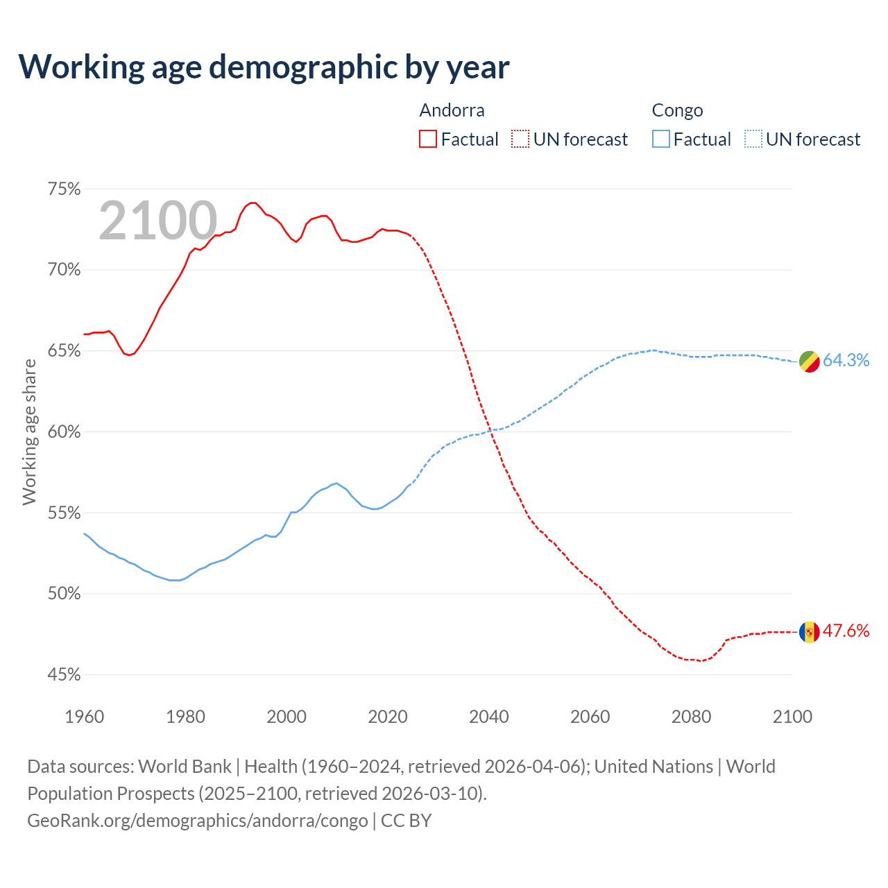 - Andorra has 60.7K working age adults (aged 15-64) vs 3.78M in the Congo.