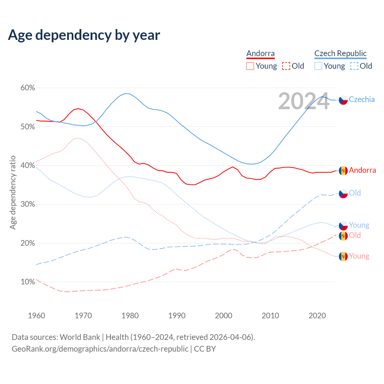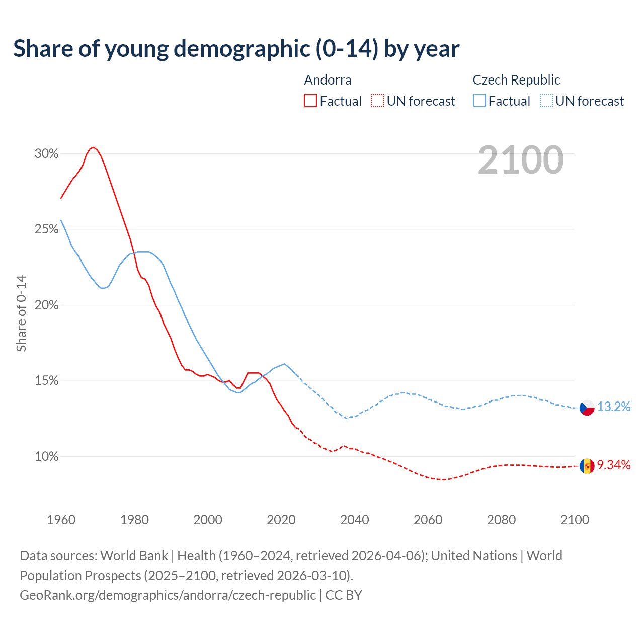 - The share of young demographic (0-15 years old) in Andorra is 11.9% vs 15.4% in the Czech Republic.