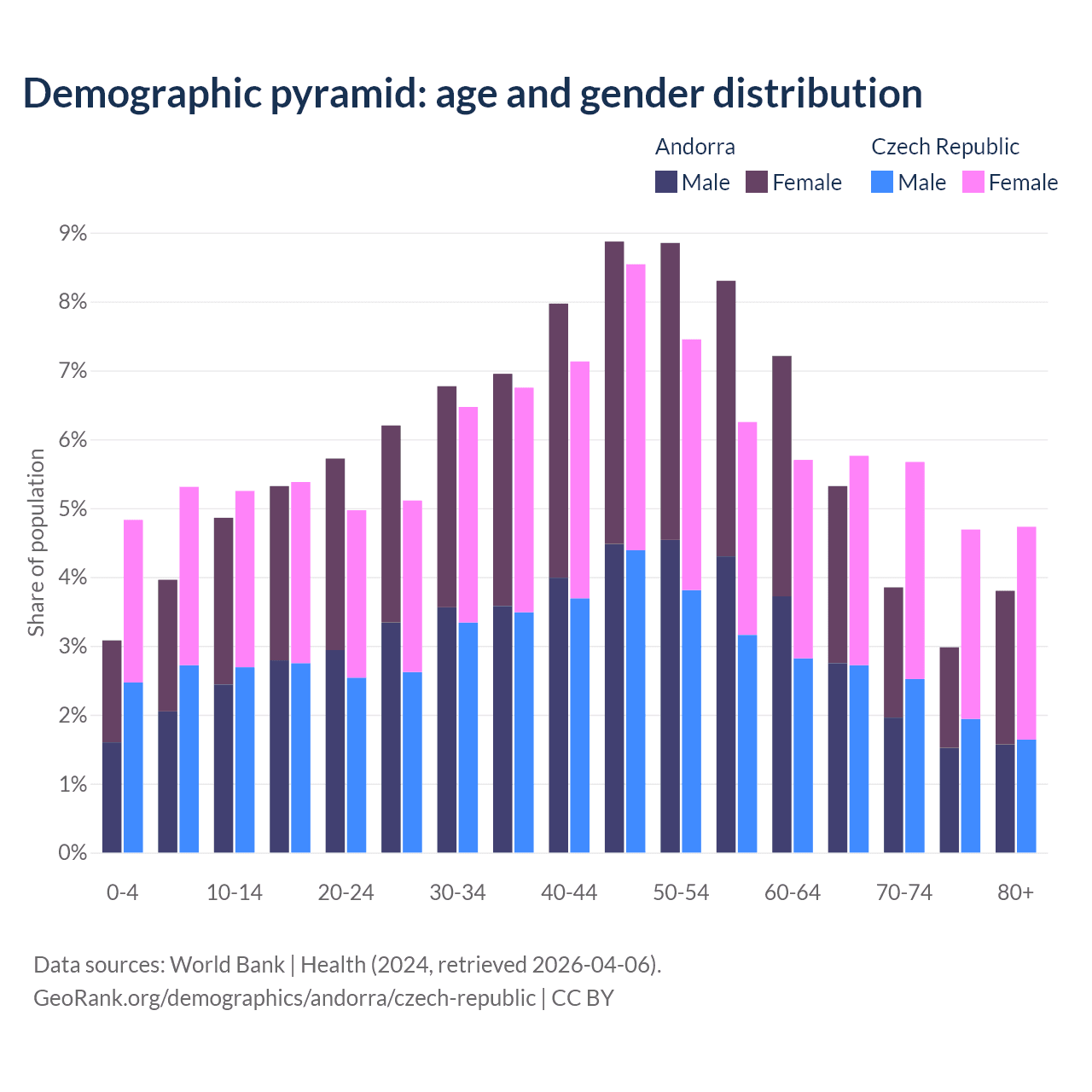 - Andorra is ranked 18/196 by median age (oldest to youngest) vs 21/196 for the Czech Republic.